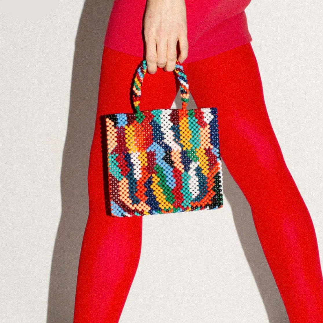 Add a unique pop of color with handbags that spark joy! Each is one of a kind, hand beaded by artisans in Ghana with wild patterns using colorful acrylic beads. Snap close on style with flap, all with top handle construction.