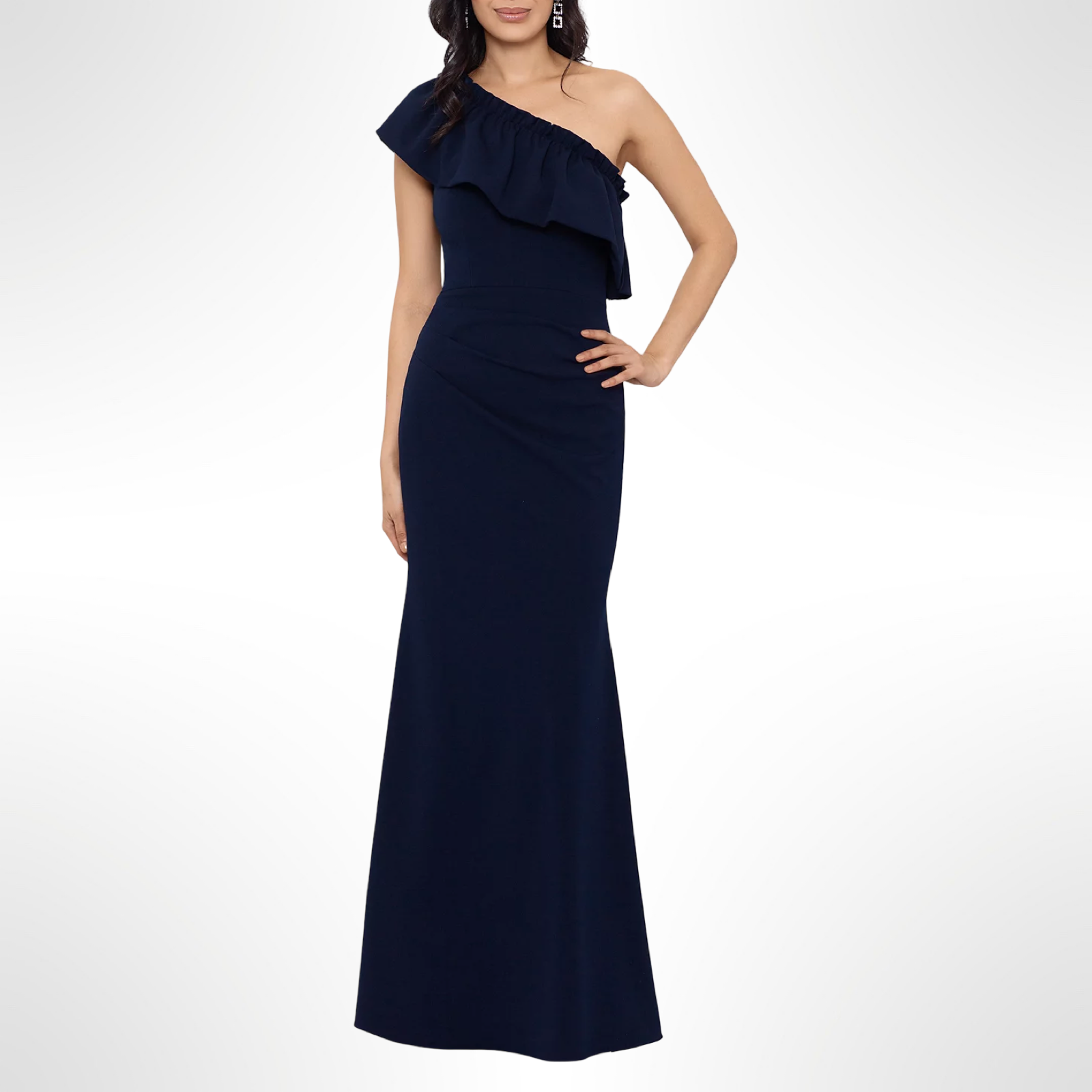 One shoulder full length evening gown with waist pleat detail.
