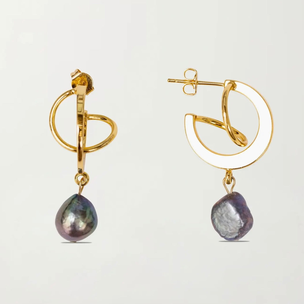 Tahitian black pearl stone on swirl post earring, 14k gold plated.