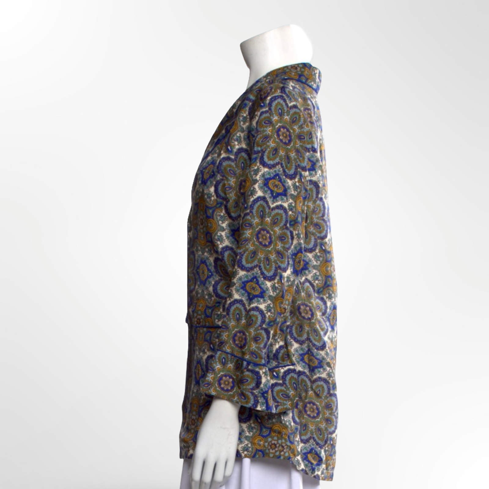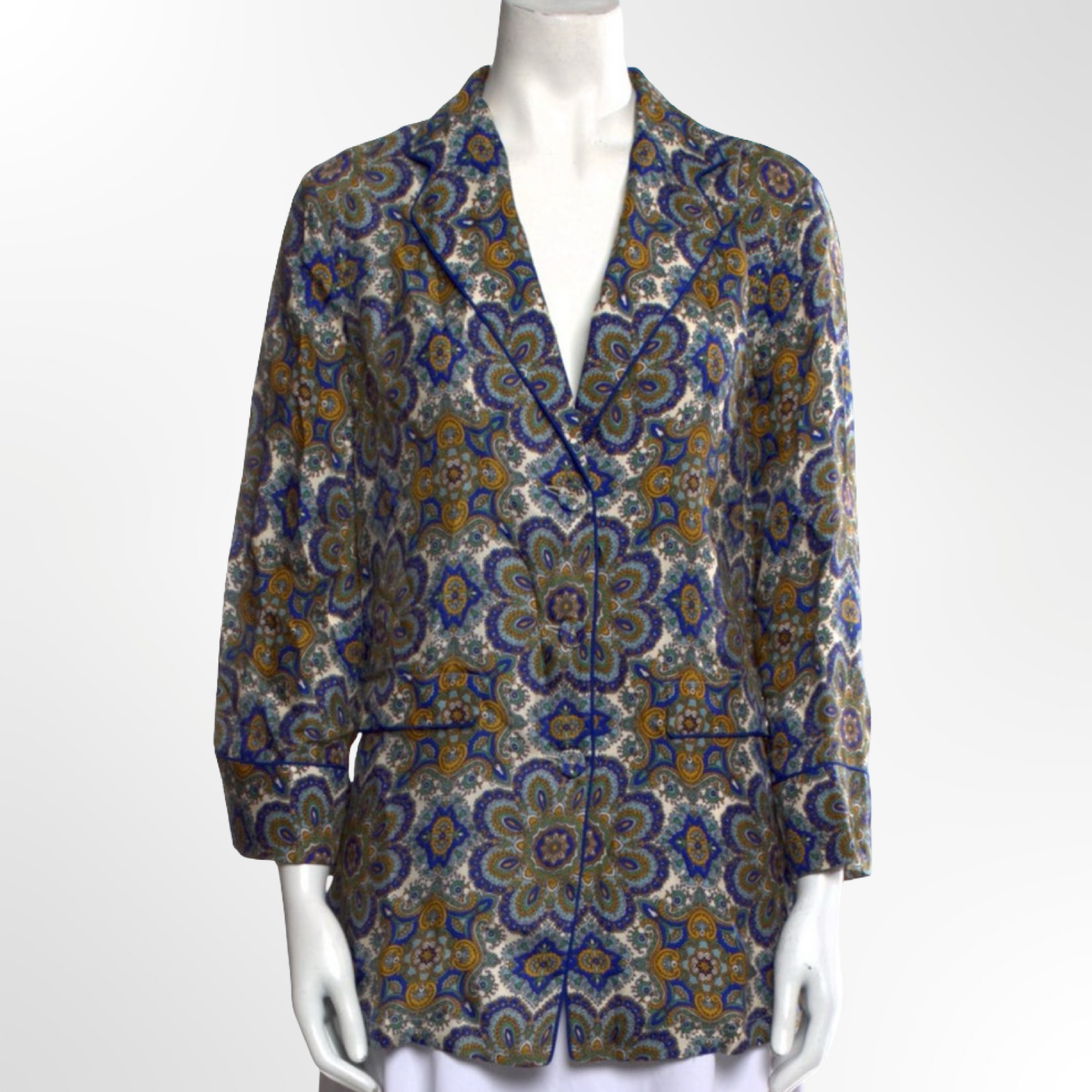 Silky button up top in blue paisley print with piping trim. NWT.