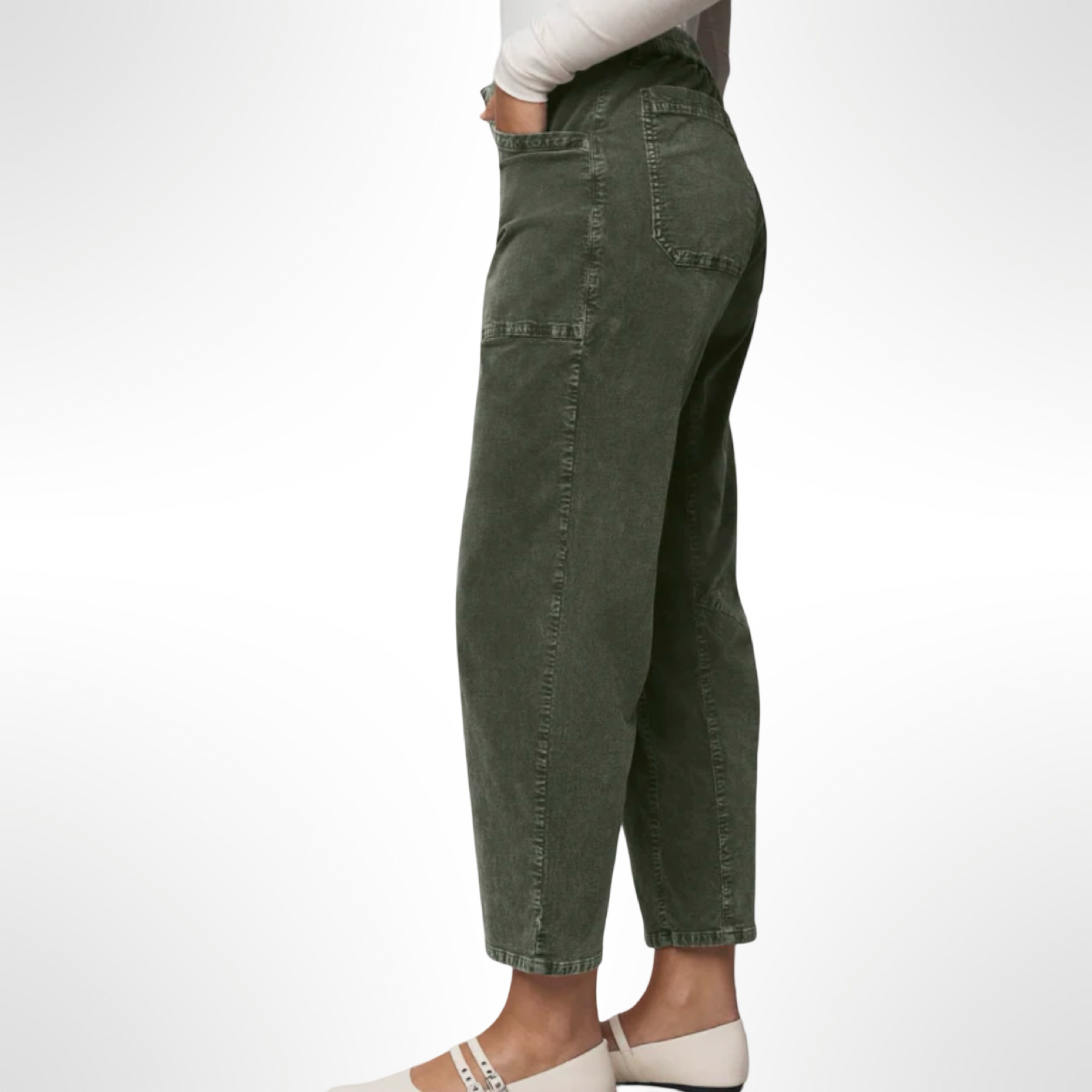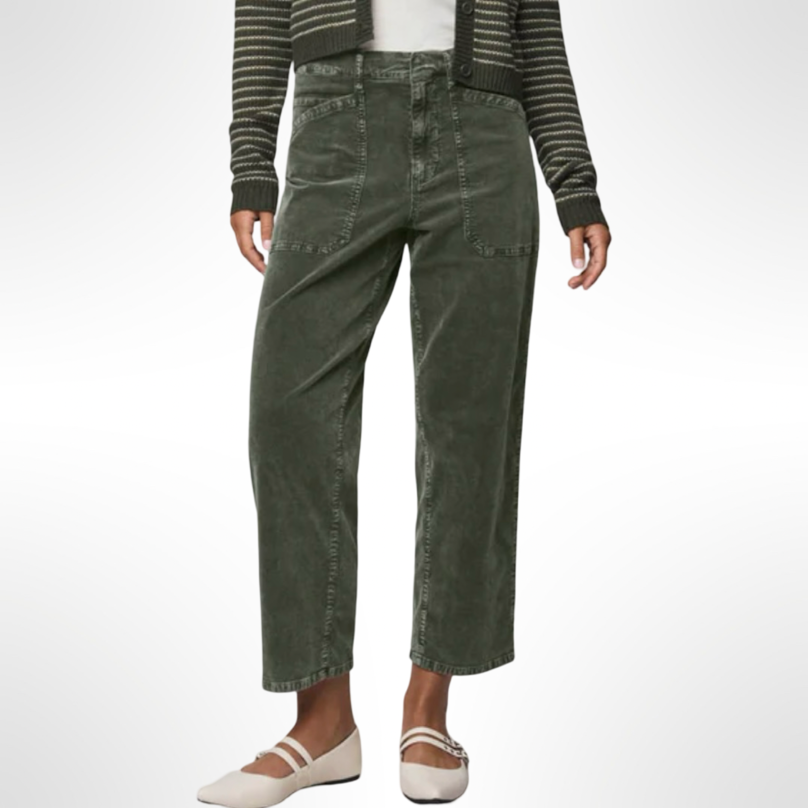 Wide leg corduroy pant with front and back pockets in spruce green color.