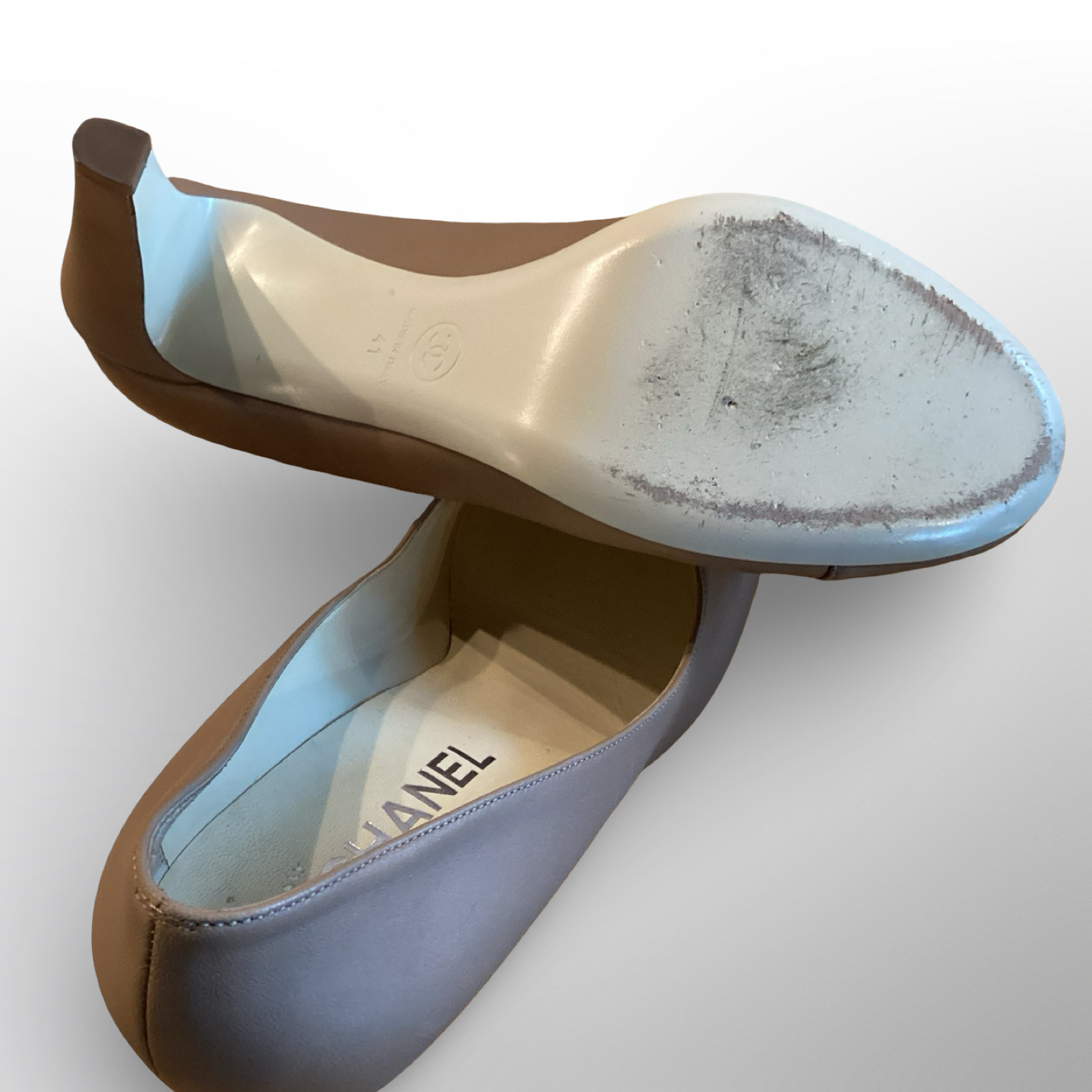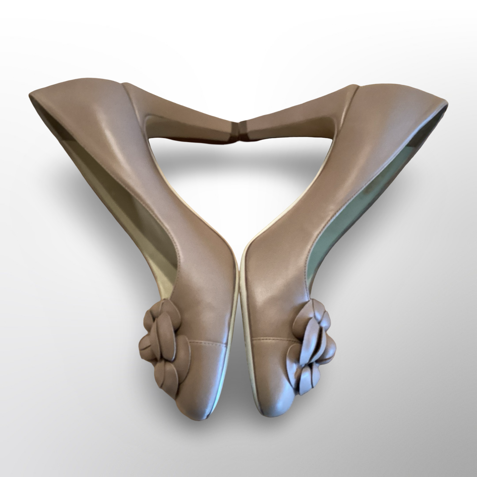 A versatile classic, this nude heel goes anywhere. In smooth beige leather with round toe heel, and complete with iconic camellia flower at toe. Very good condition.