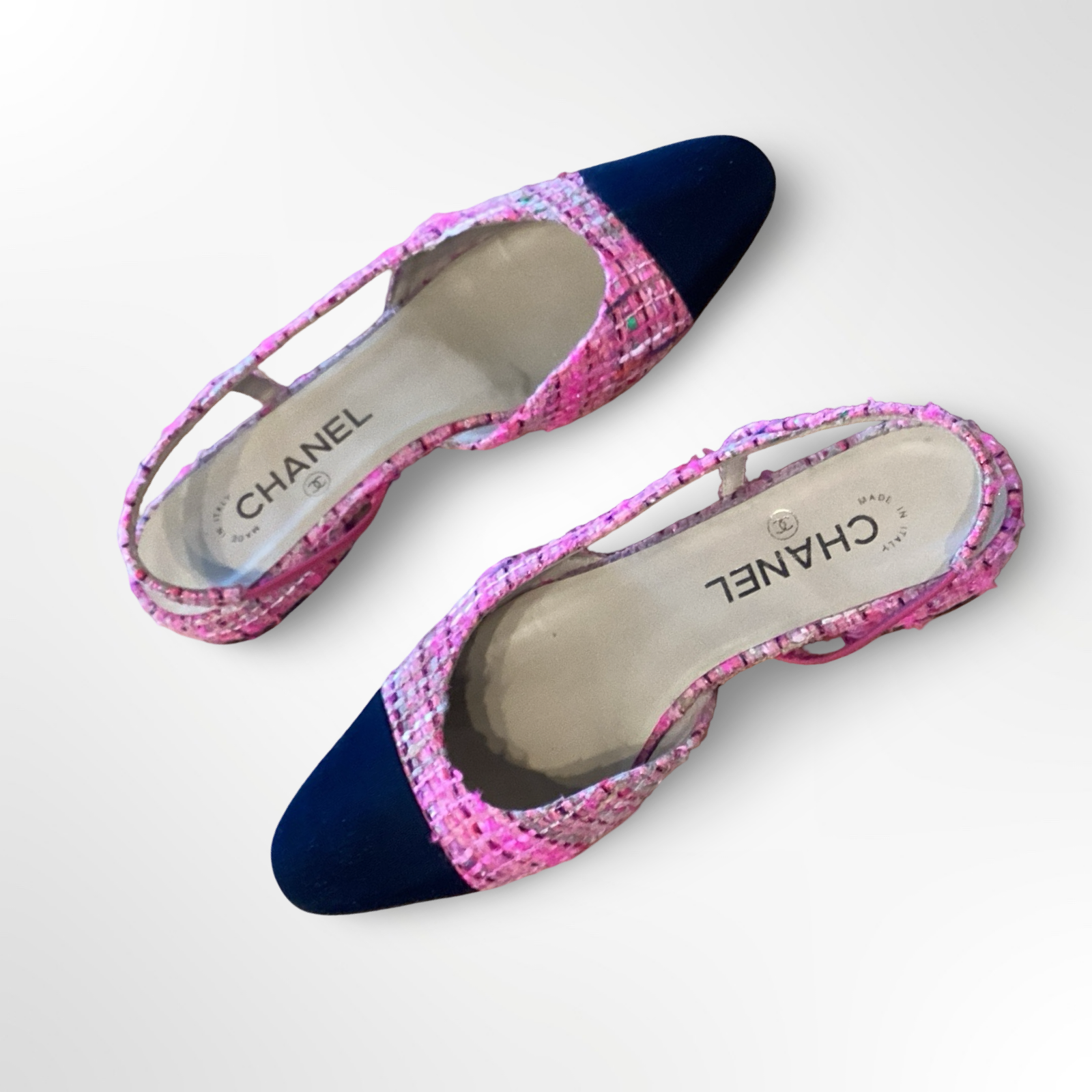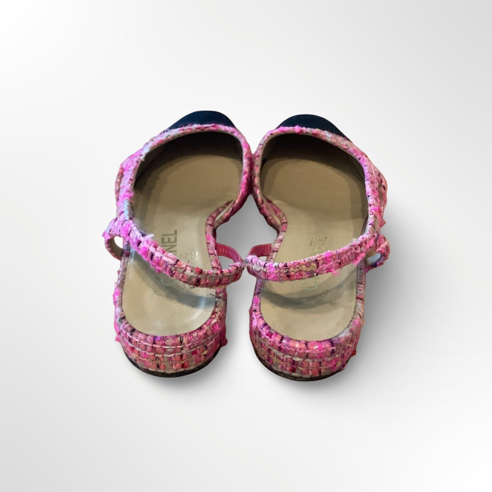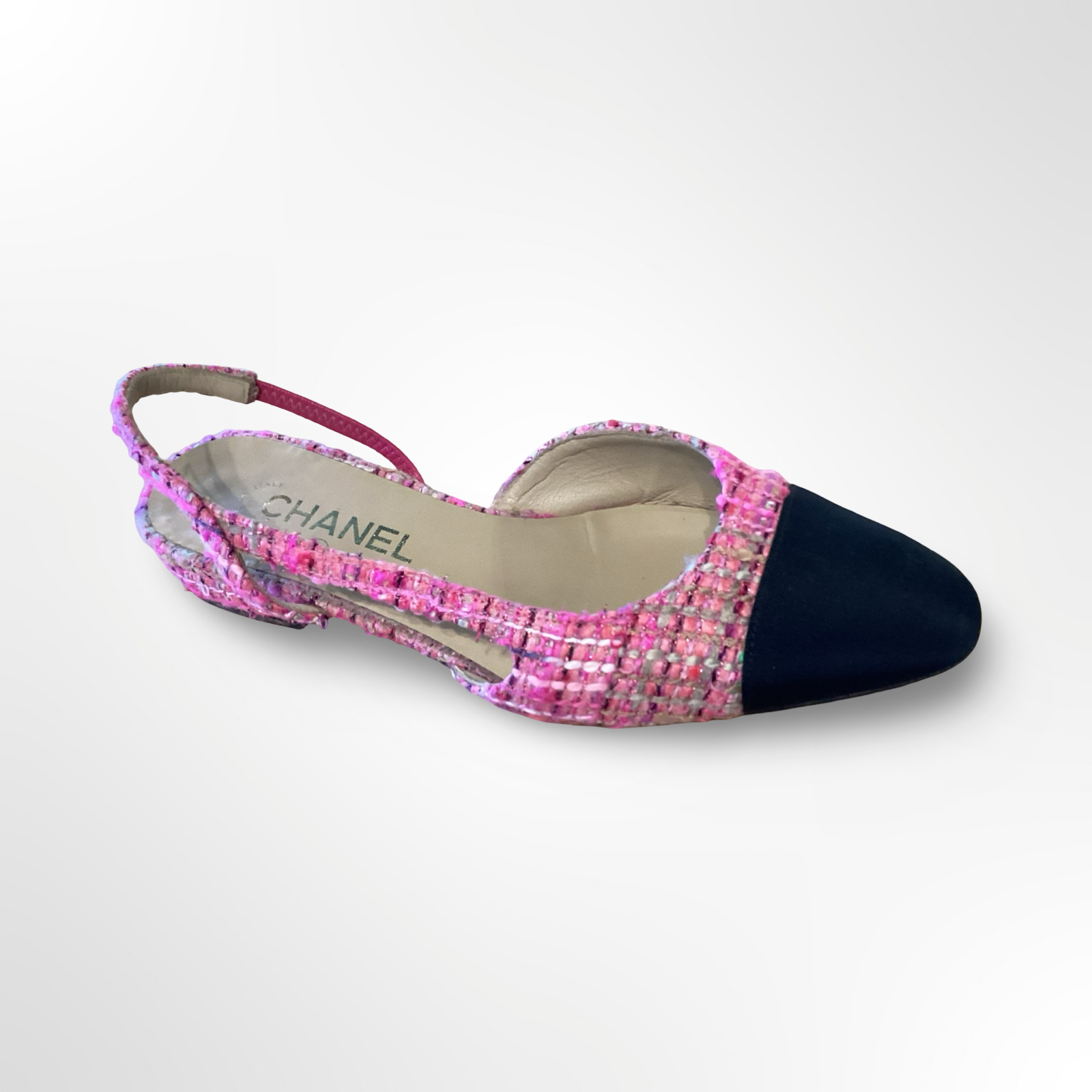 Hot pink tweed is an eye catching pop on these sweet slingback flats with the iconic cap toe. Very good condition.