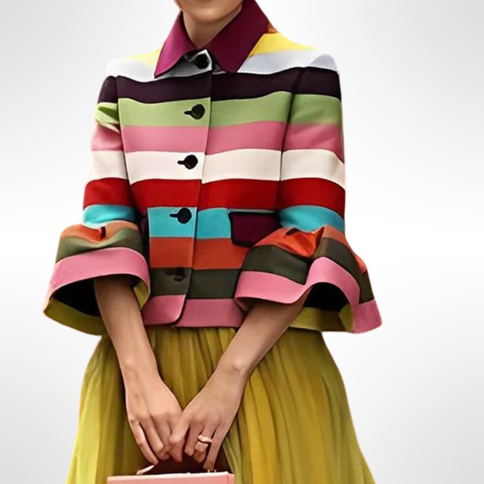 Bold and playful, this striped blazer features vibrant rainbow hues with flared sleeves and a tailored silhouette for a statement-making look.