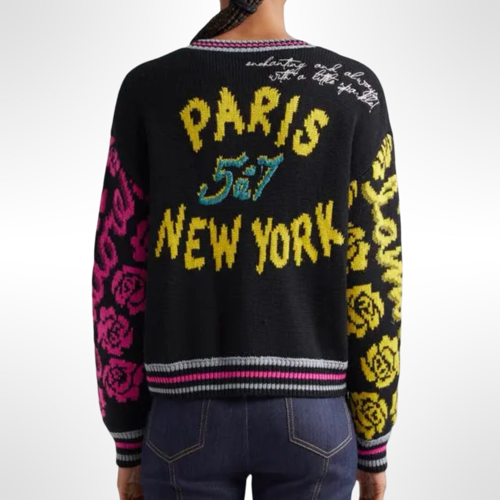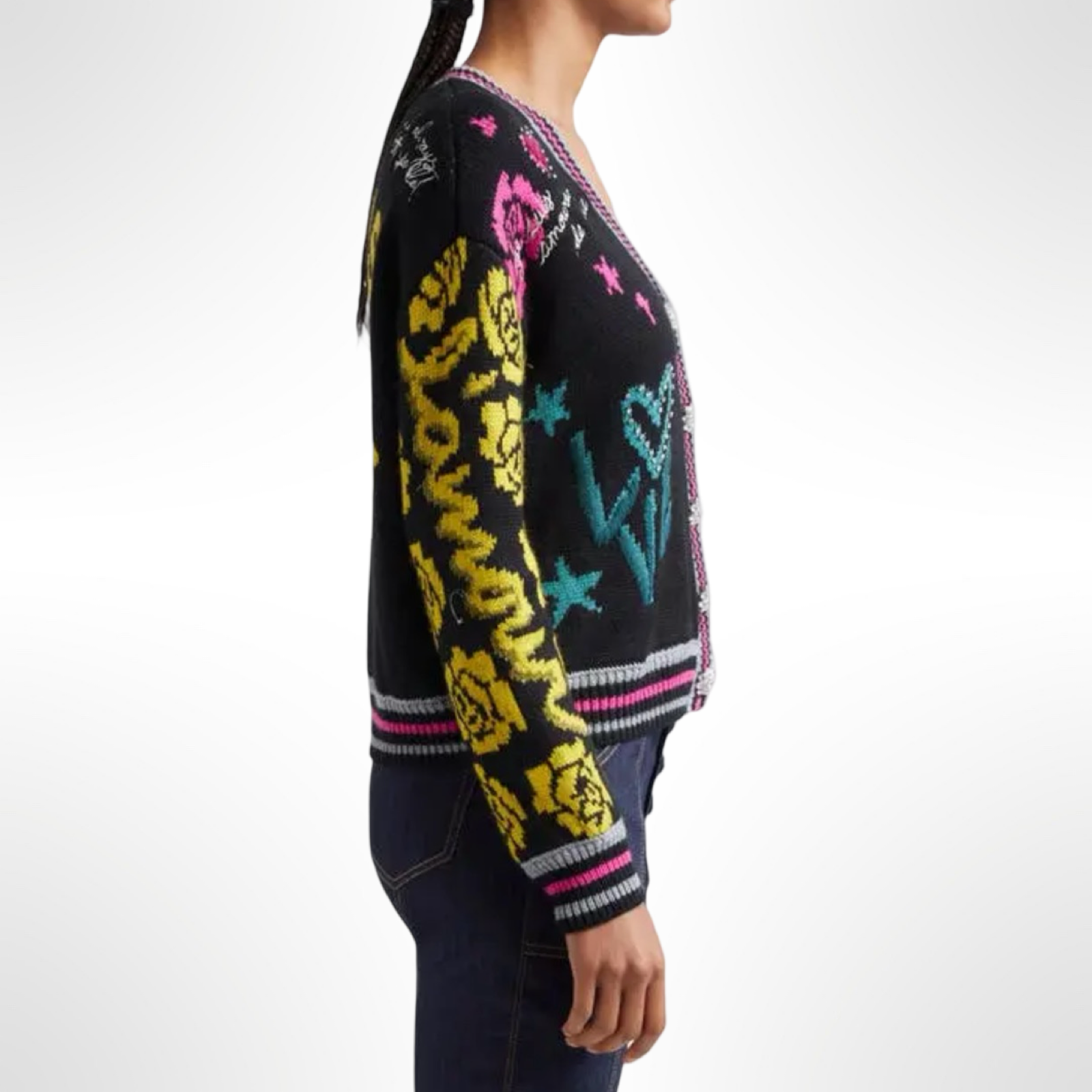 Embroidered and embellished, this cardigan is an eye catcher. Black background with bold color pops and beaded accents, snap front close. Very good condition.