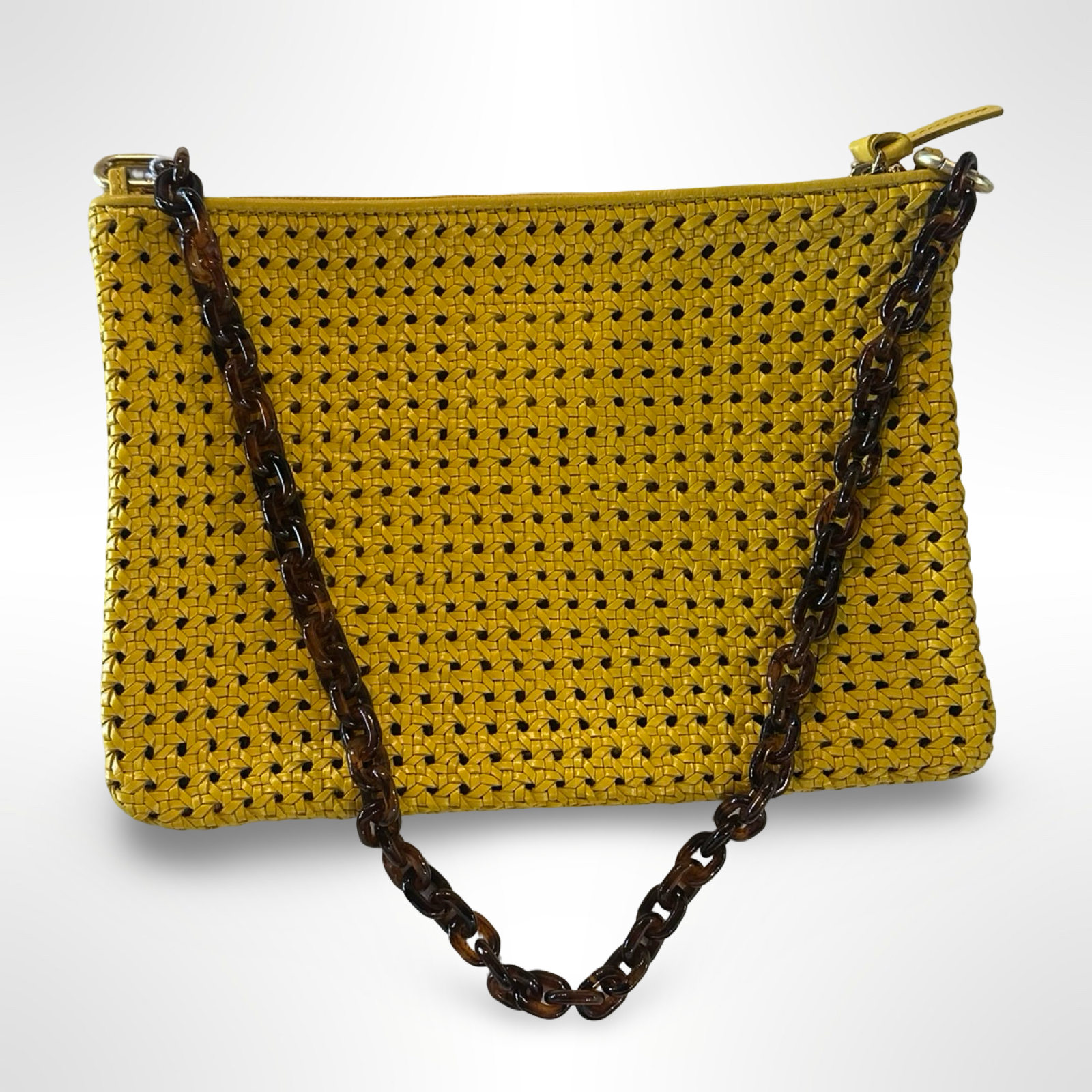 This sunny yellow woven leather bag is the color of happy. Finished with gold tone hardware and zip close, and complete with tort acrylic chain crossbody strap. Pristine condition.