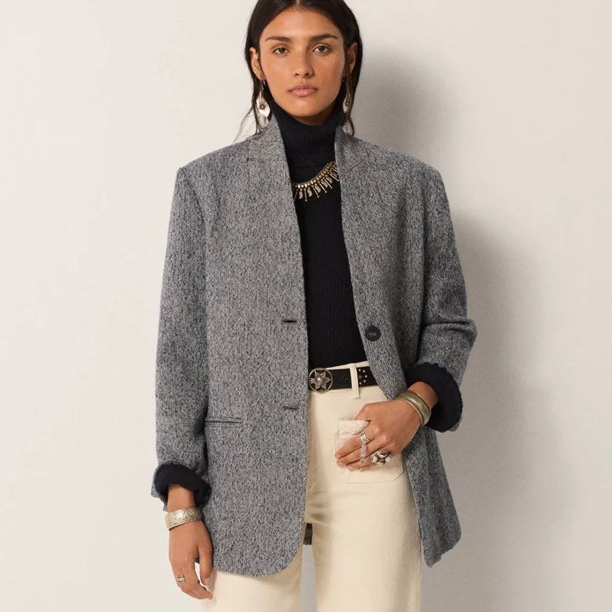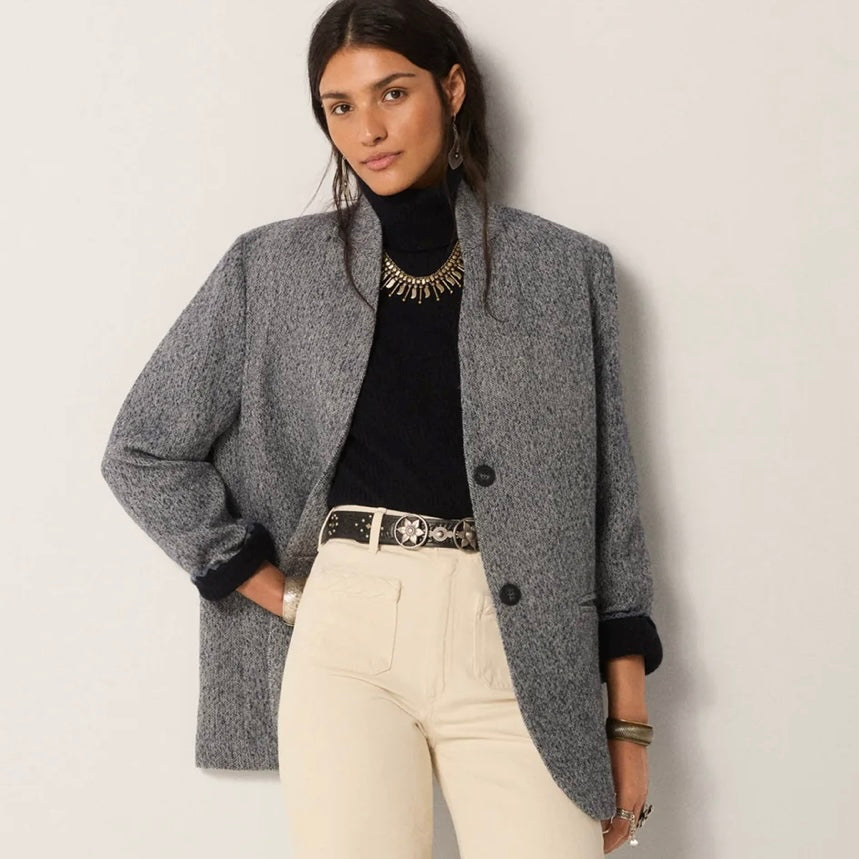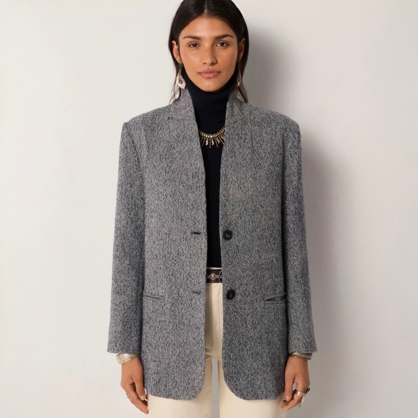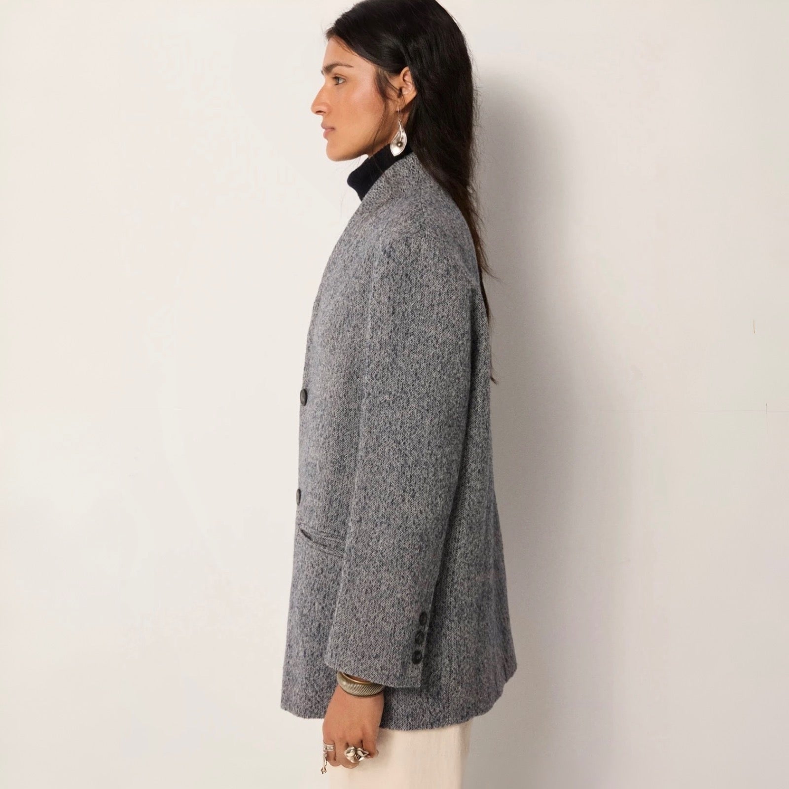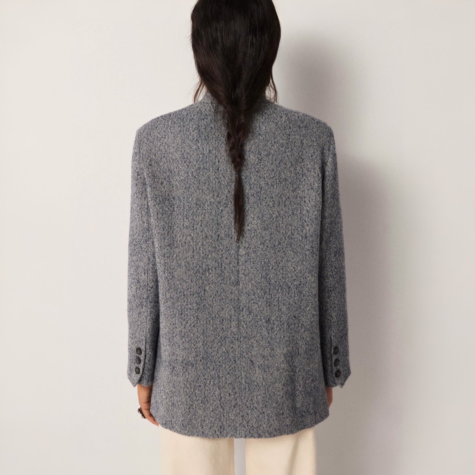 Textured wool-blend handloom creates a blazer with quiet presence. Its cool blue-grey tone is fresh, modern, and easy to layer. Relaxed fit and clean lines keep it versatile, playing with feminine structure with nod to menswear construction.