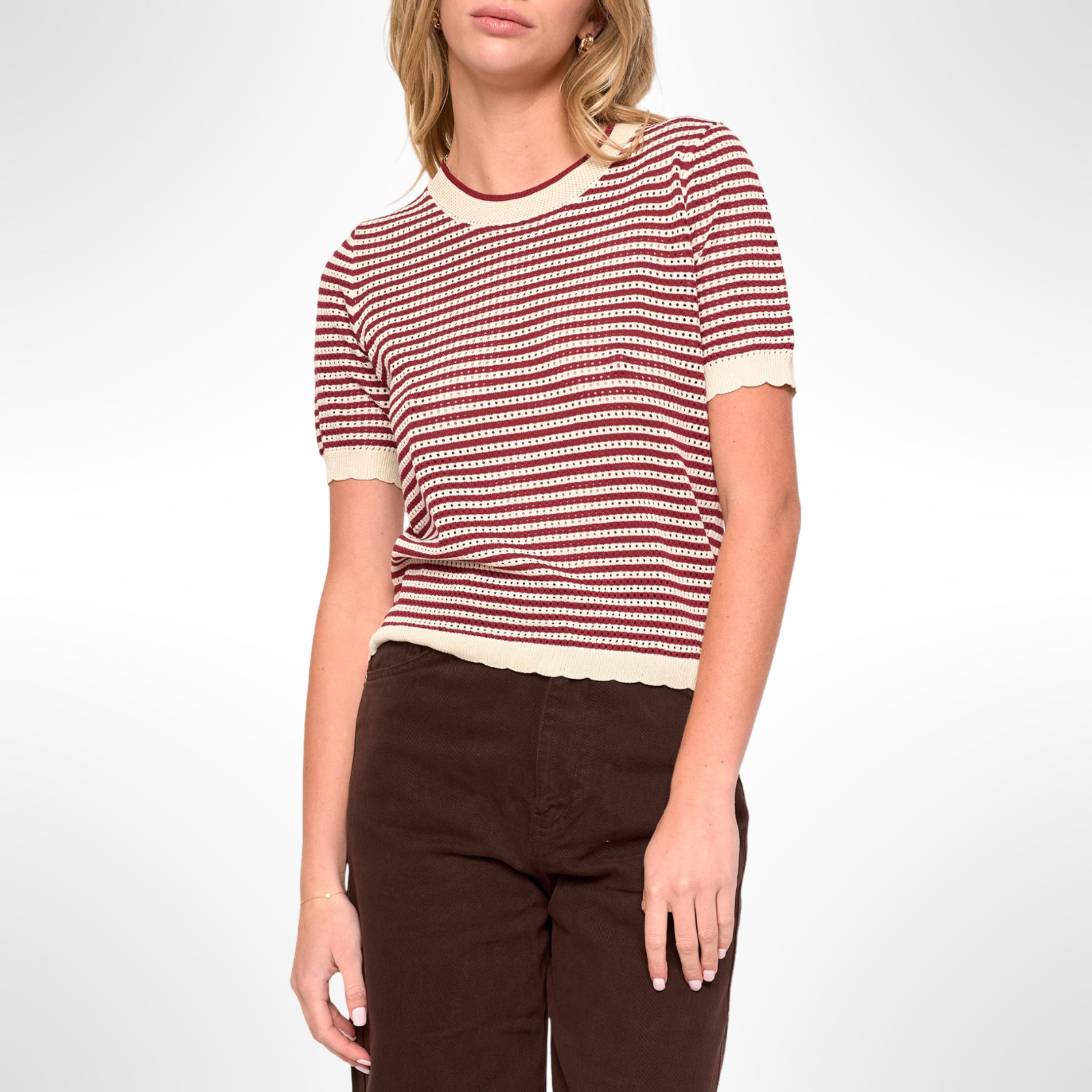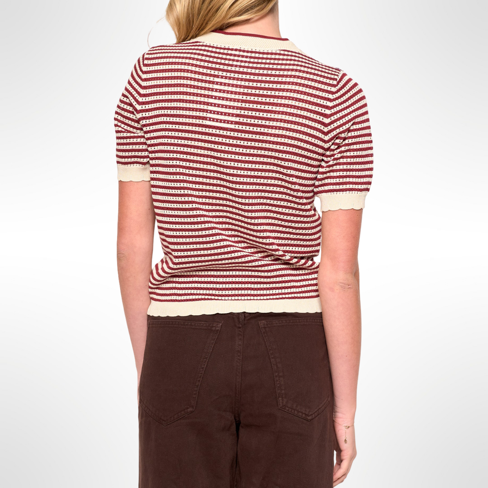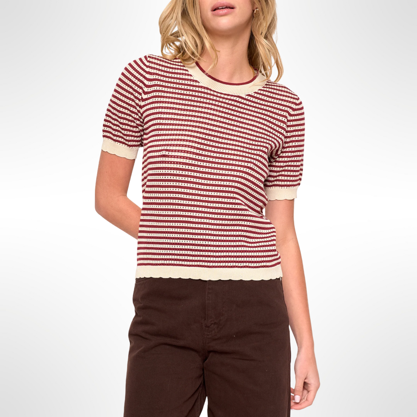 This vintage-inspired open-knit Cora sweater top, in an Auberge Ivory stripe, features delicate scalloped edge sleeves and a contrasting cream athletic band neckline for a sporty yet elegant touch. Lightweight and breathable, it’s perfect for layering or wearing alone to add a subtle retro flair to any outfit.