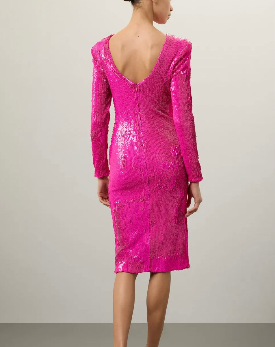 Brighten up any event with this playful burst of hot pink sequins. This dazzling shift dress features a fun knee slit for a flirty step and a dip back detail that adds just the right amount of surprise. Perfect for dancing the night away!