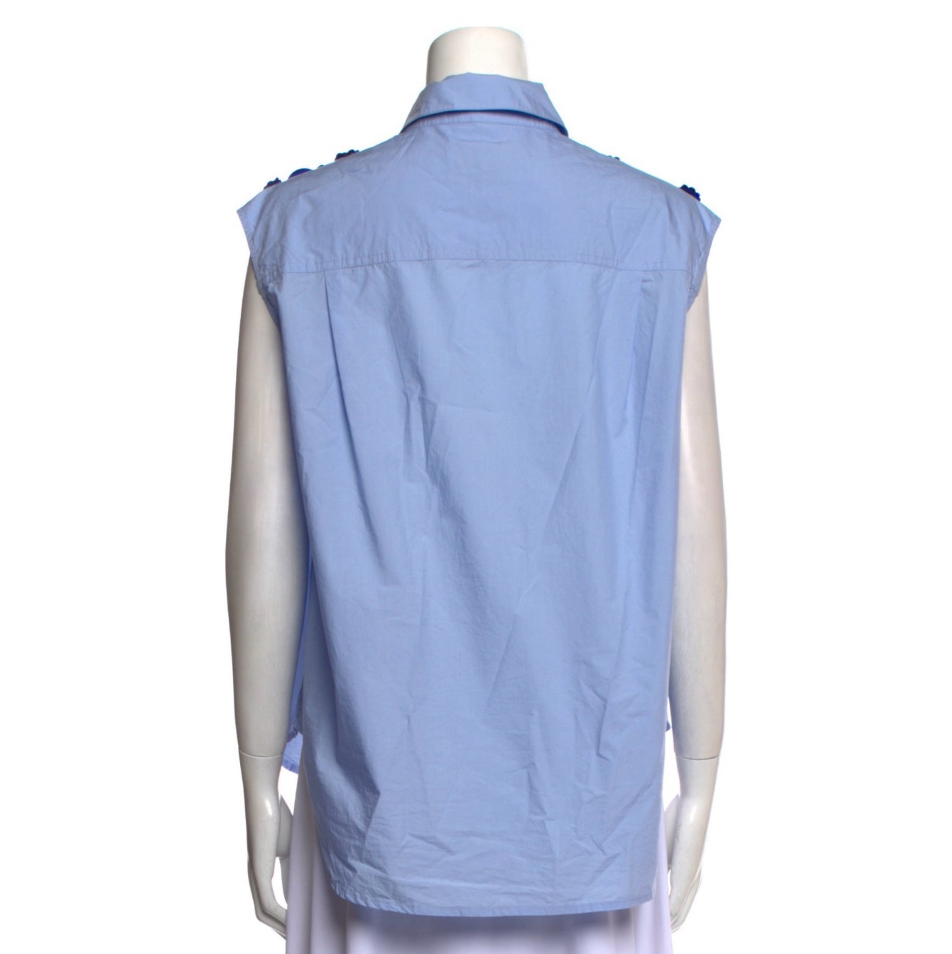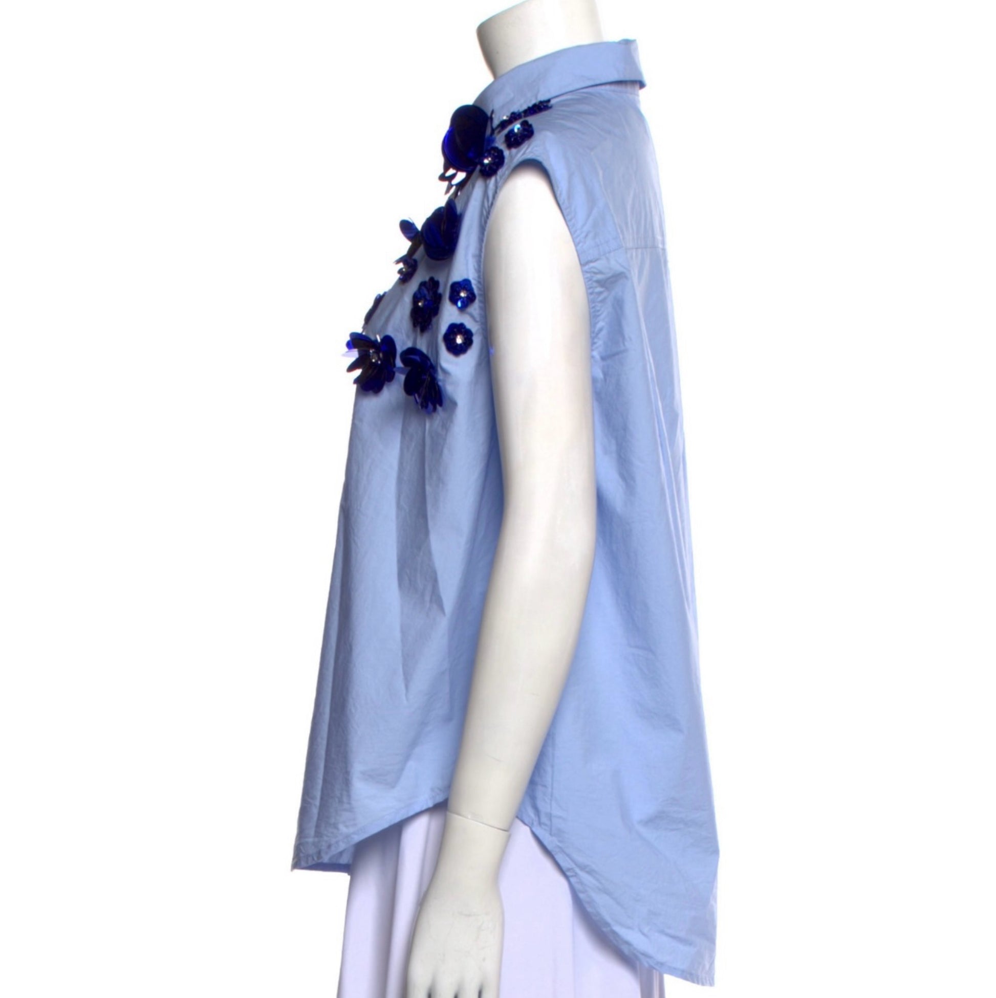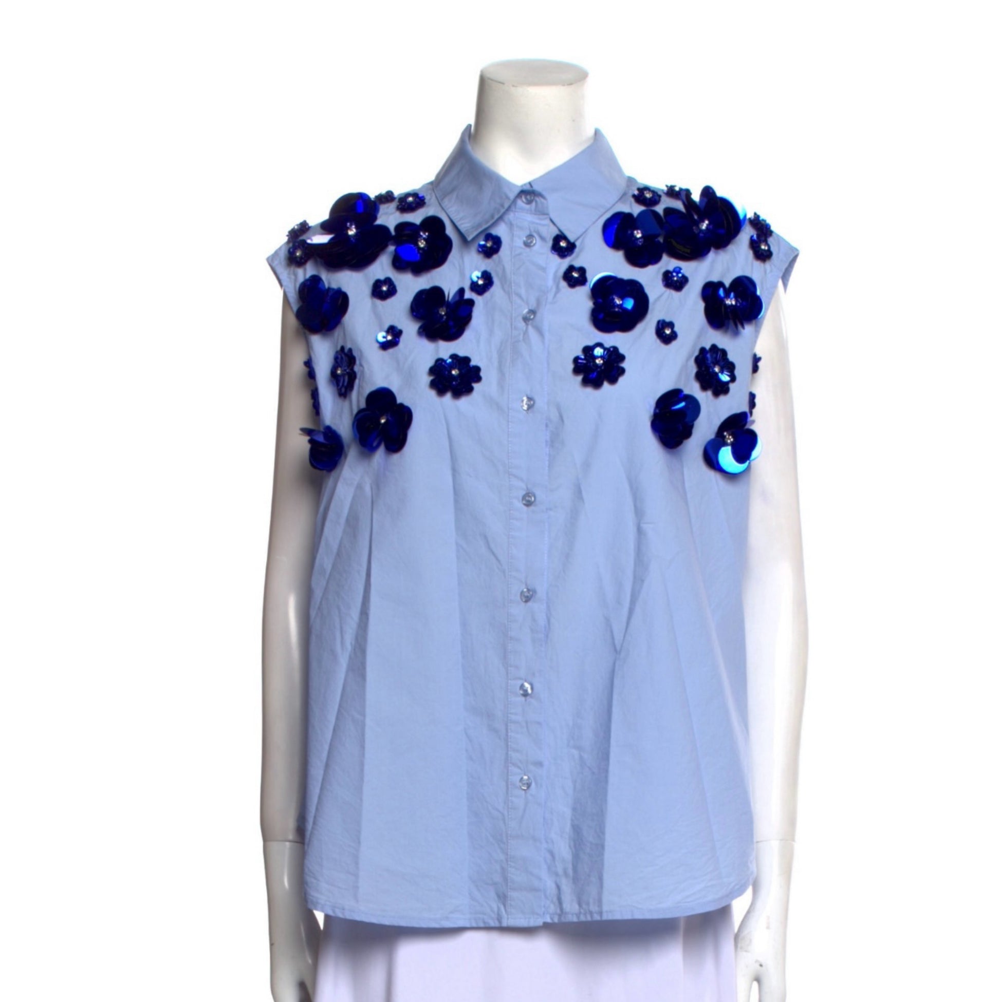 Add some pizazz. Light blue cotton sleeveless button up with metallic blue sequin flower details, NWT.