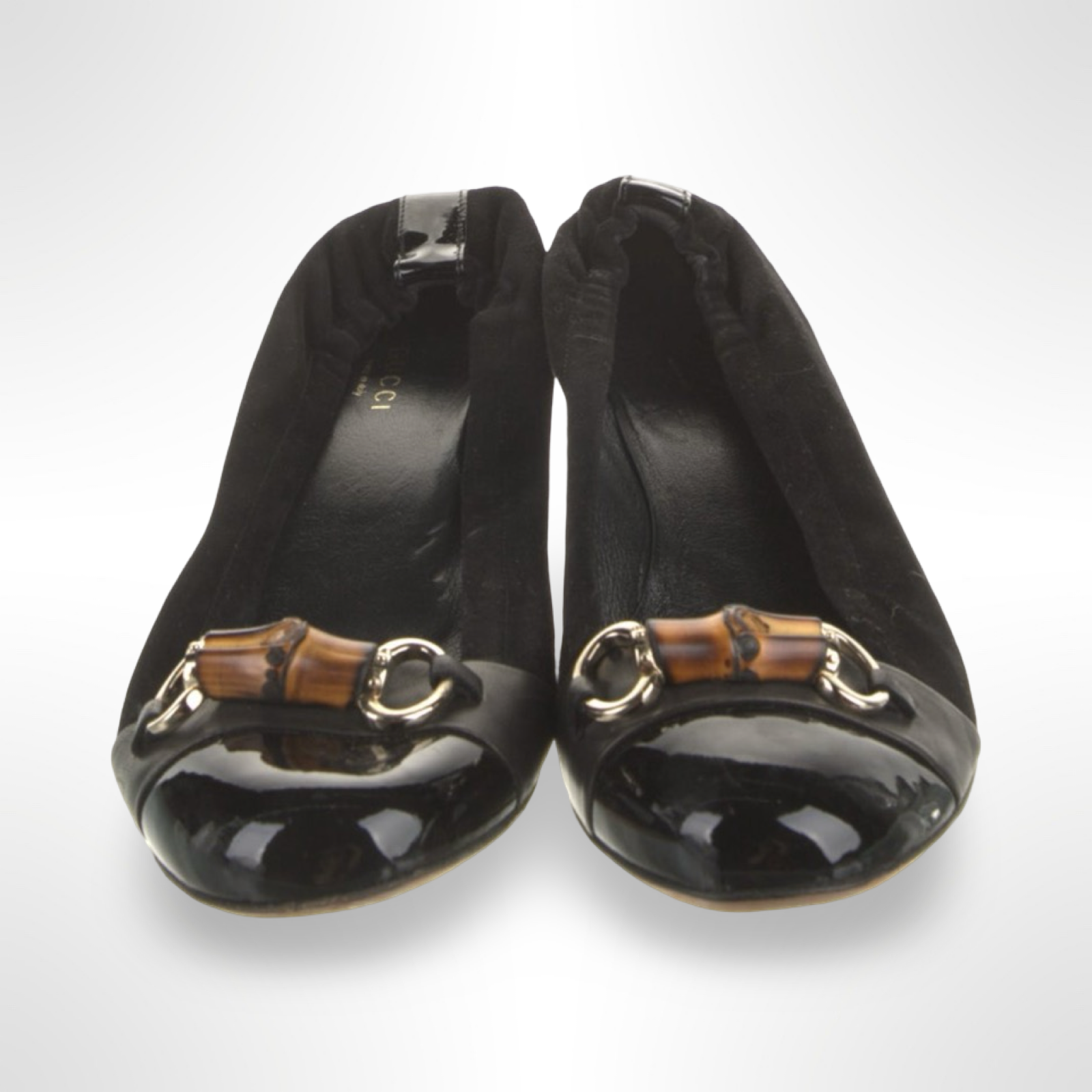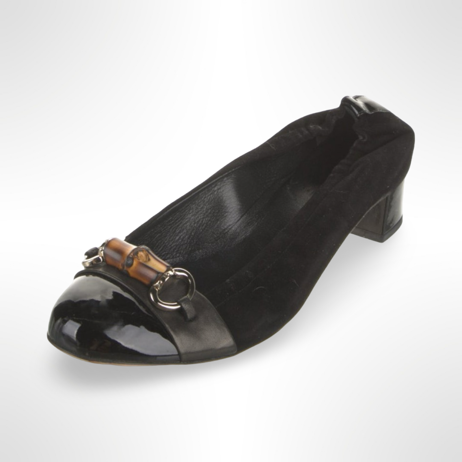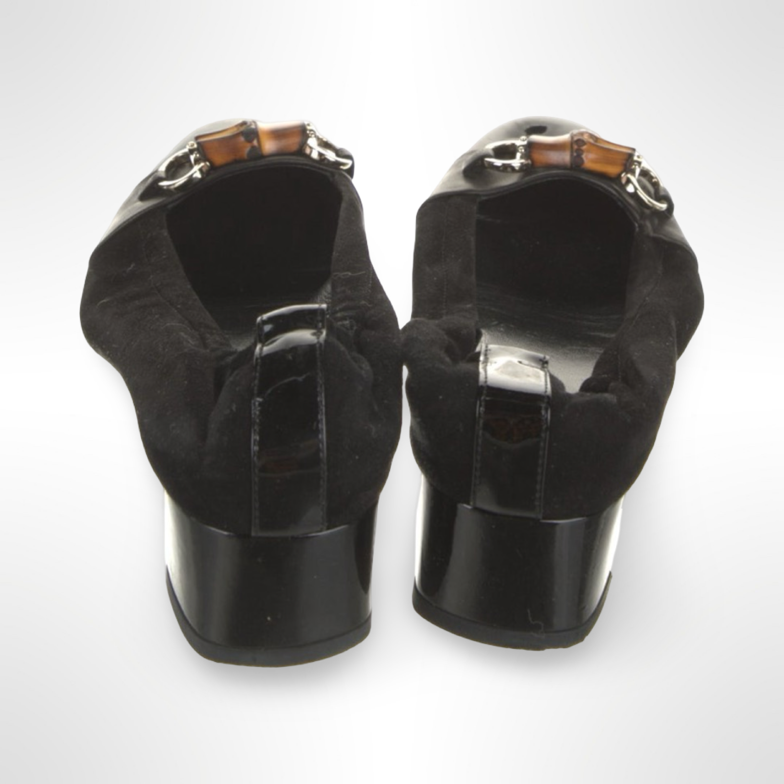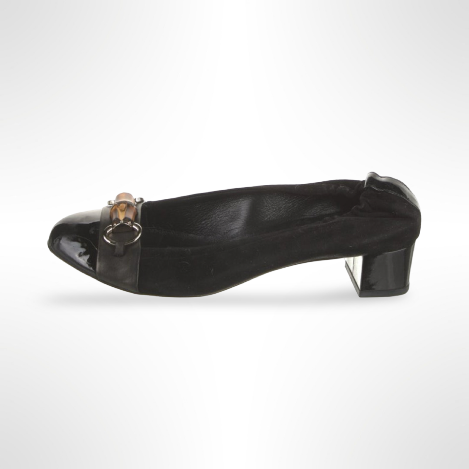 Featuring a classic round toe design, this low heel is crafted from black suede and patent leather, adorned with Gucci’s signature bamboo bit detail.