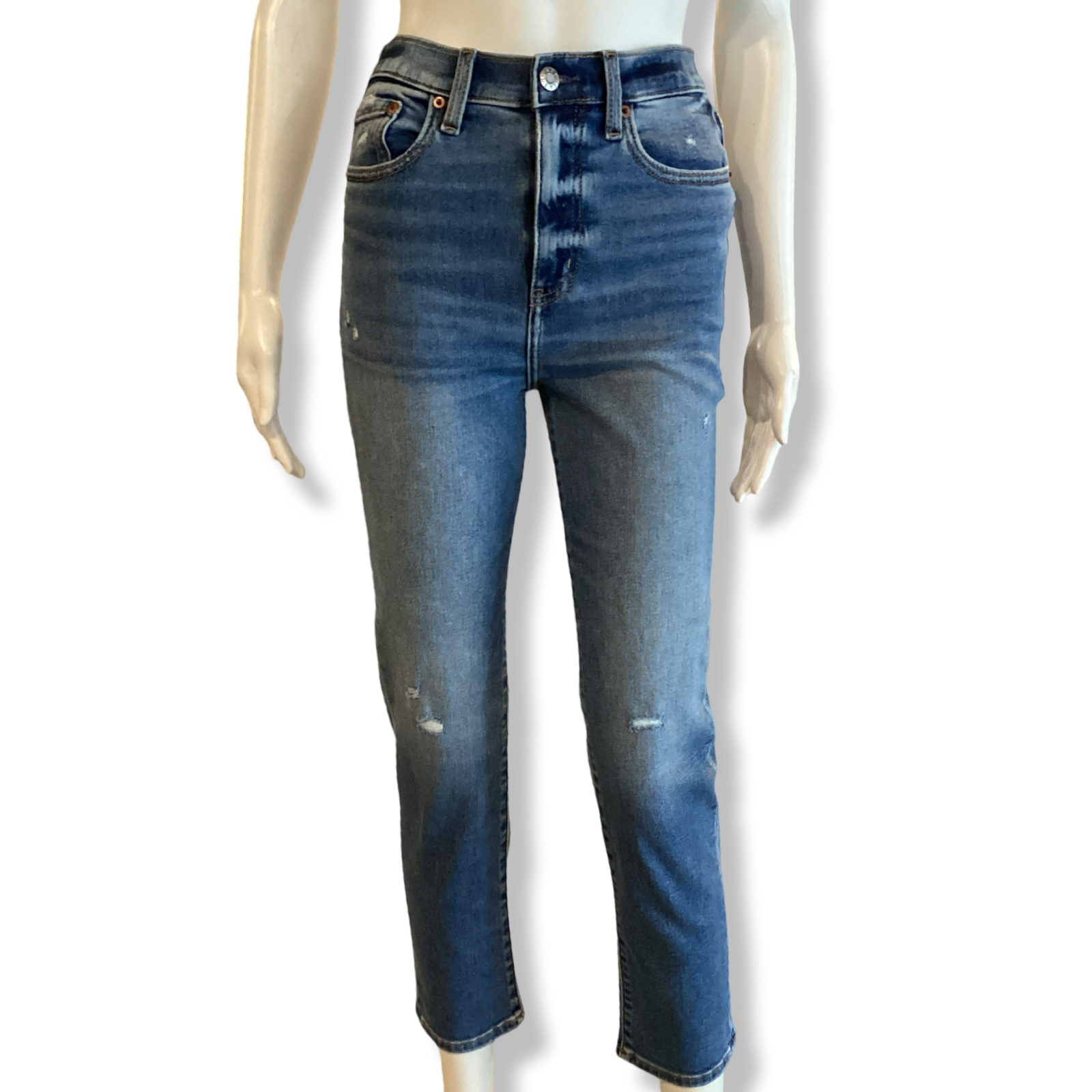 Medium wash high rise cigarette jean with minor distressing, ankle cropped, stretch denim