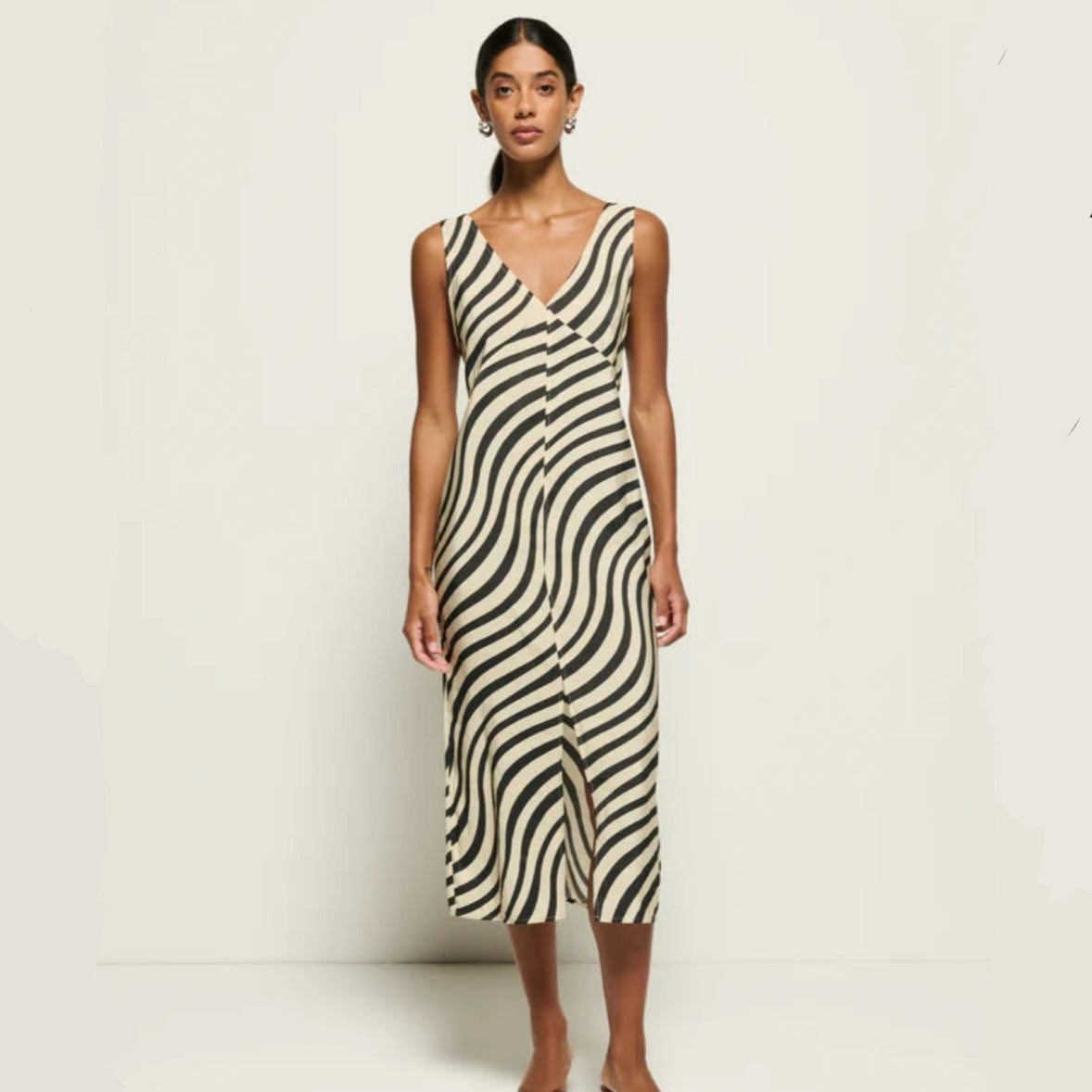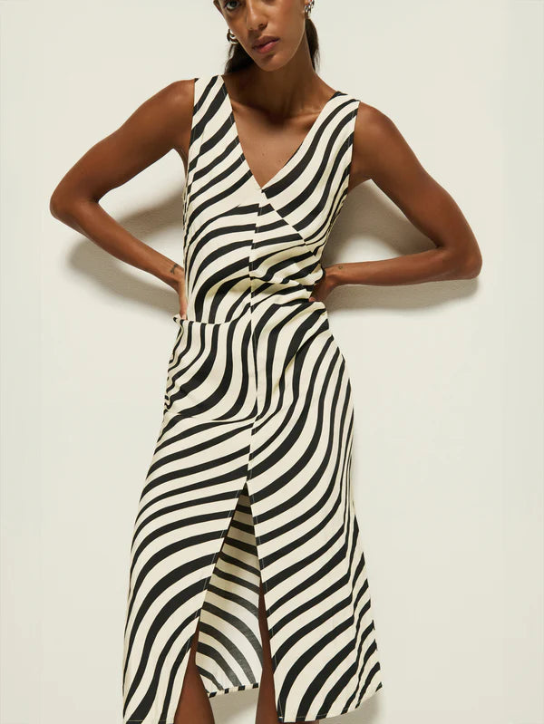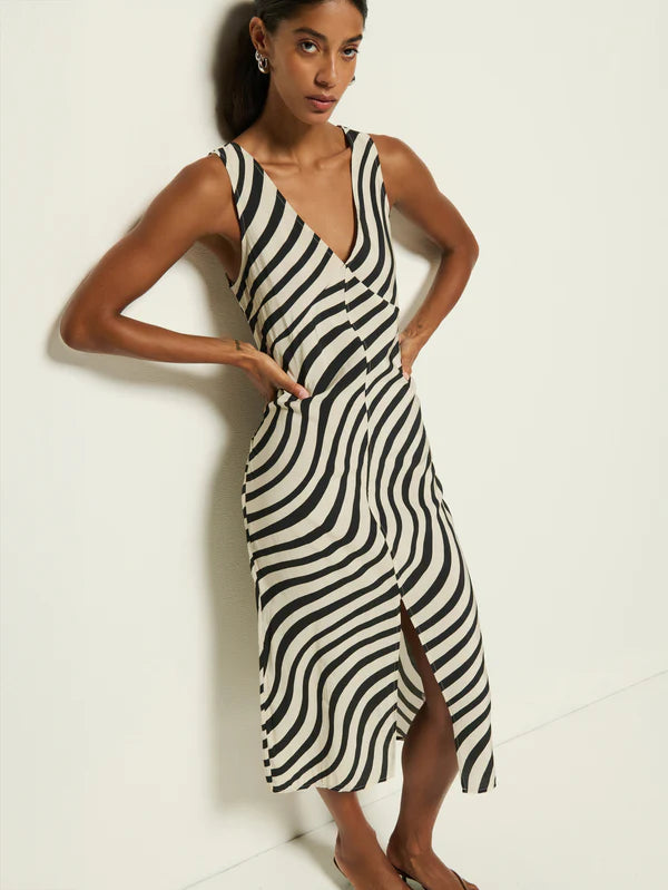 Just as audacious as she is relaxed, the Kimora Dress is designed to take you anywhere in style. Made in woven modal, this dress features a v-neckline, classic relaxed silhouette, and center front slit detailing for versatility. This one comes in black and cream Swirl Print.