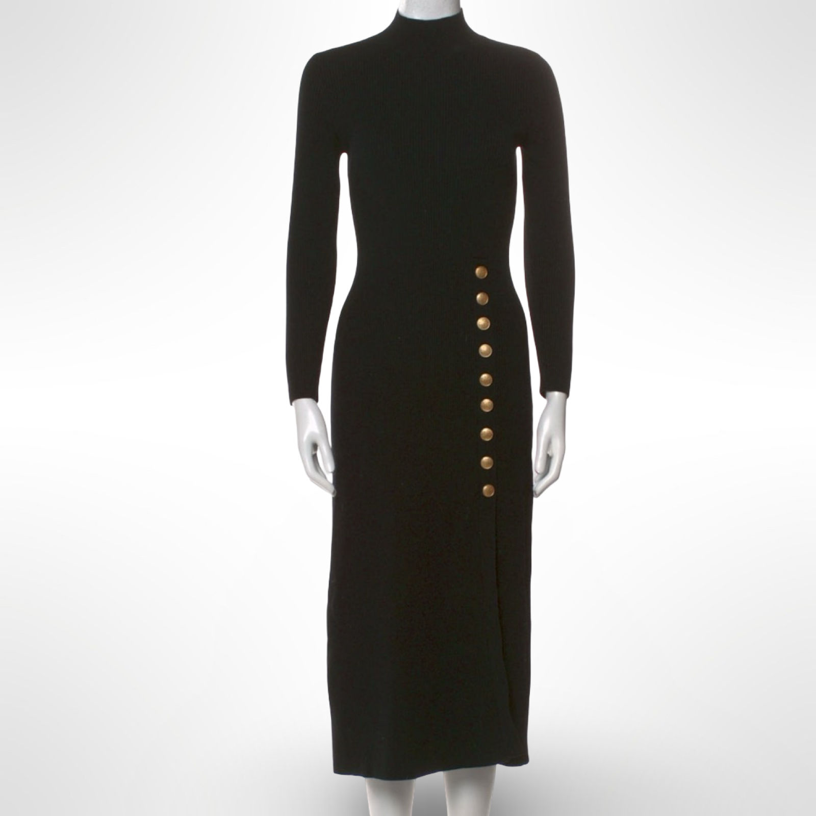 A classic black wool blend sweater dress with button up side slit detail. Pristine condition.