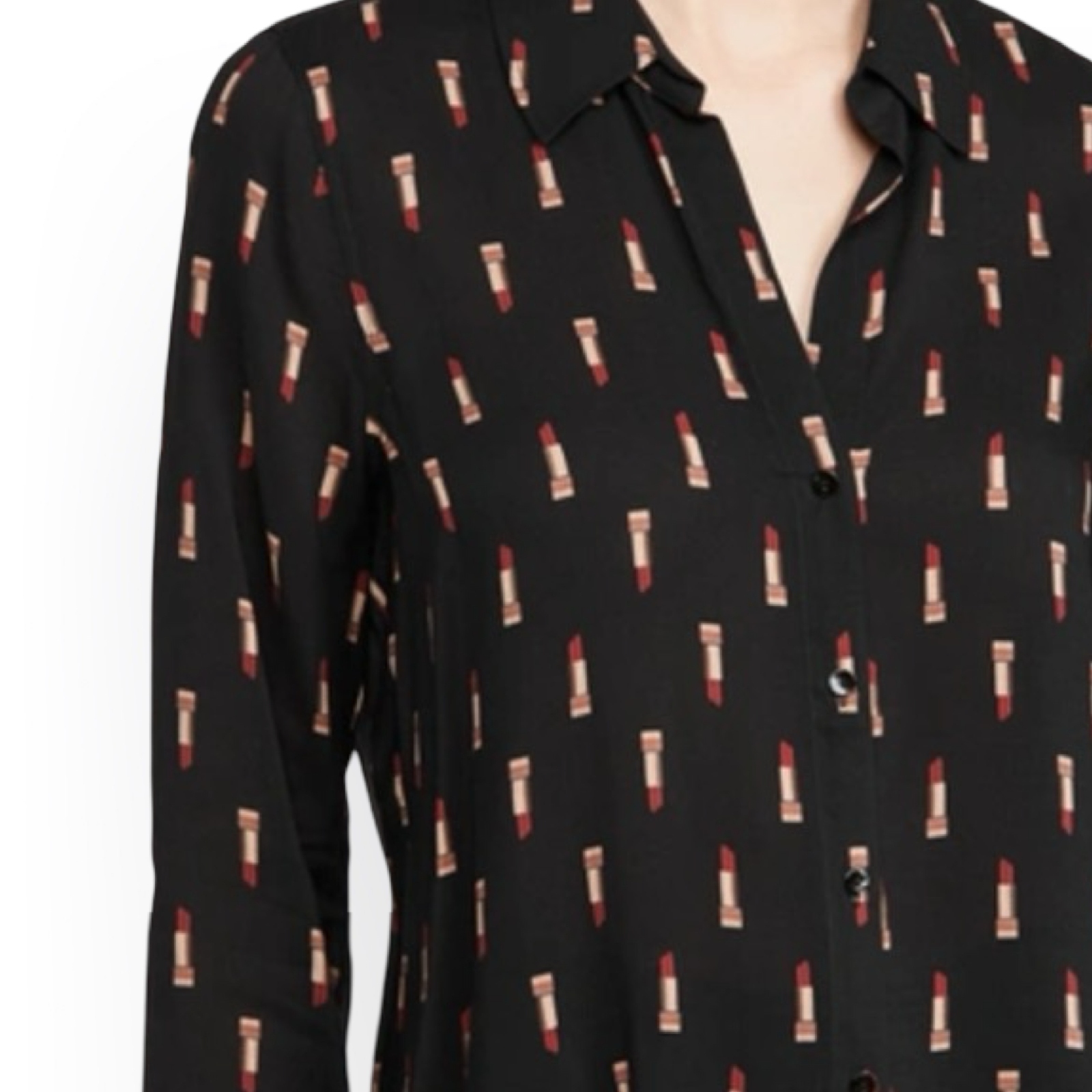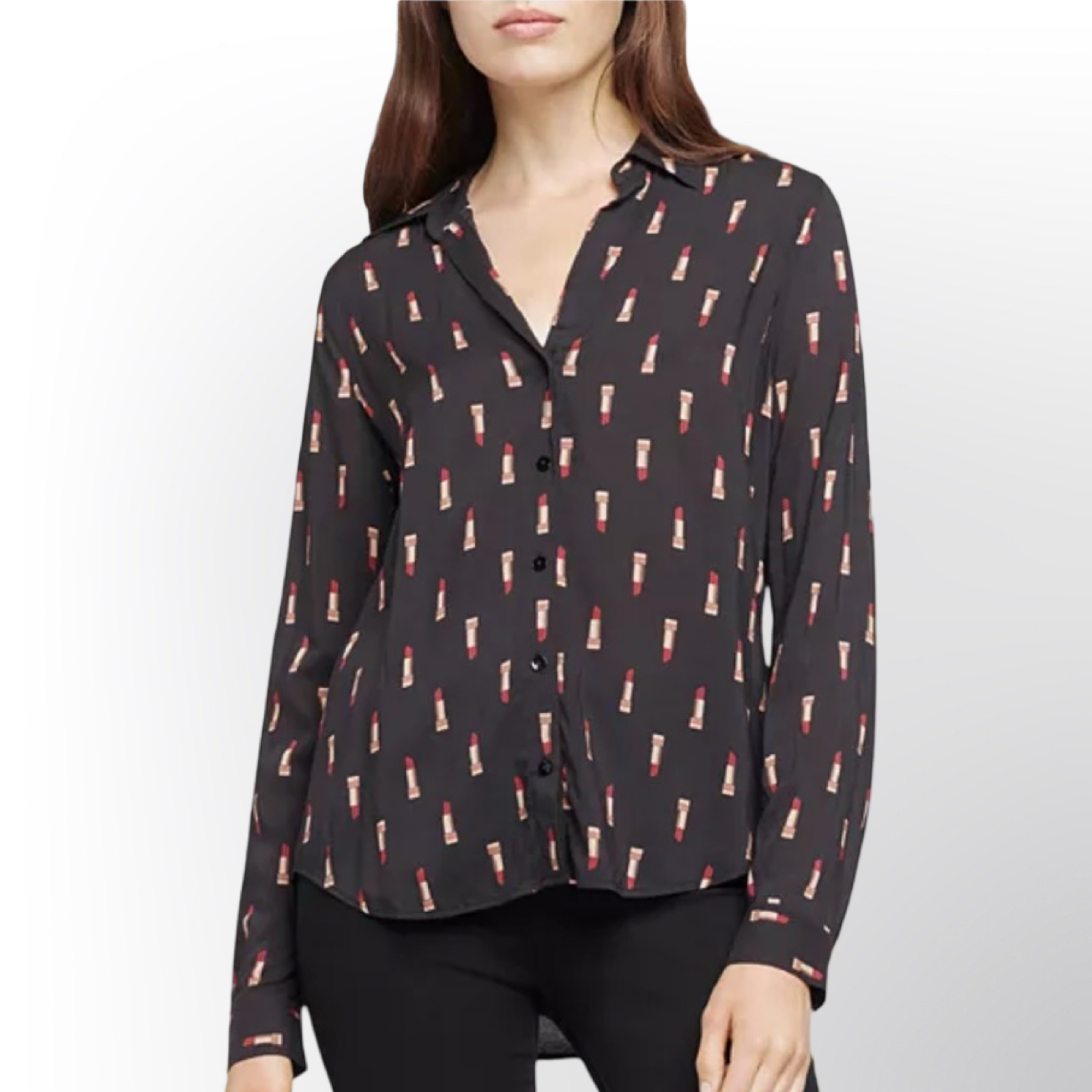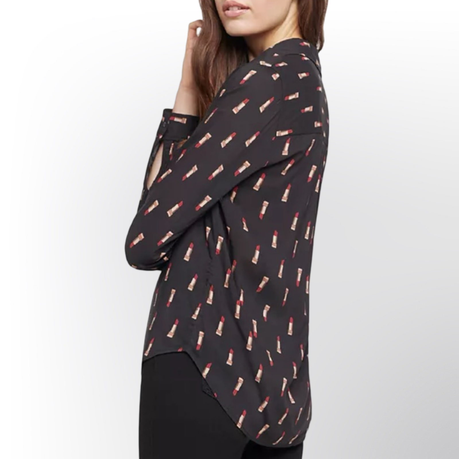 This black silky button-down blouse features a playful all-over print of lipstick motifs, combining sophistication with a touch of whimsy.