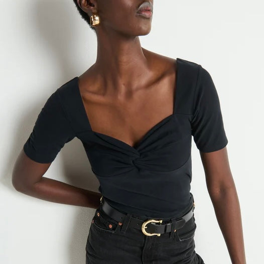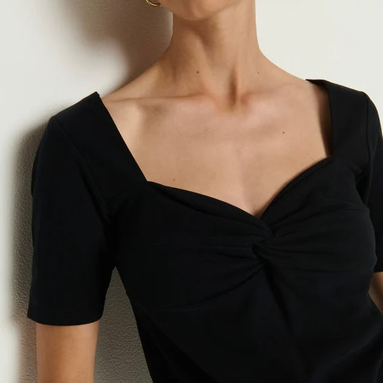 Timeless ease, made effortless. Softly structured knit with a center twist and flattering sweetheart neckline, in black pima jersey with a classic fit. Understated elegance for any occasion.