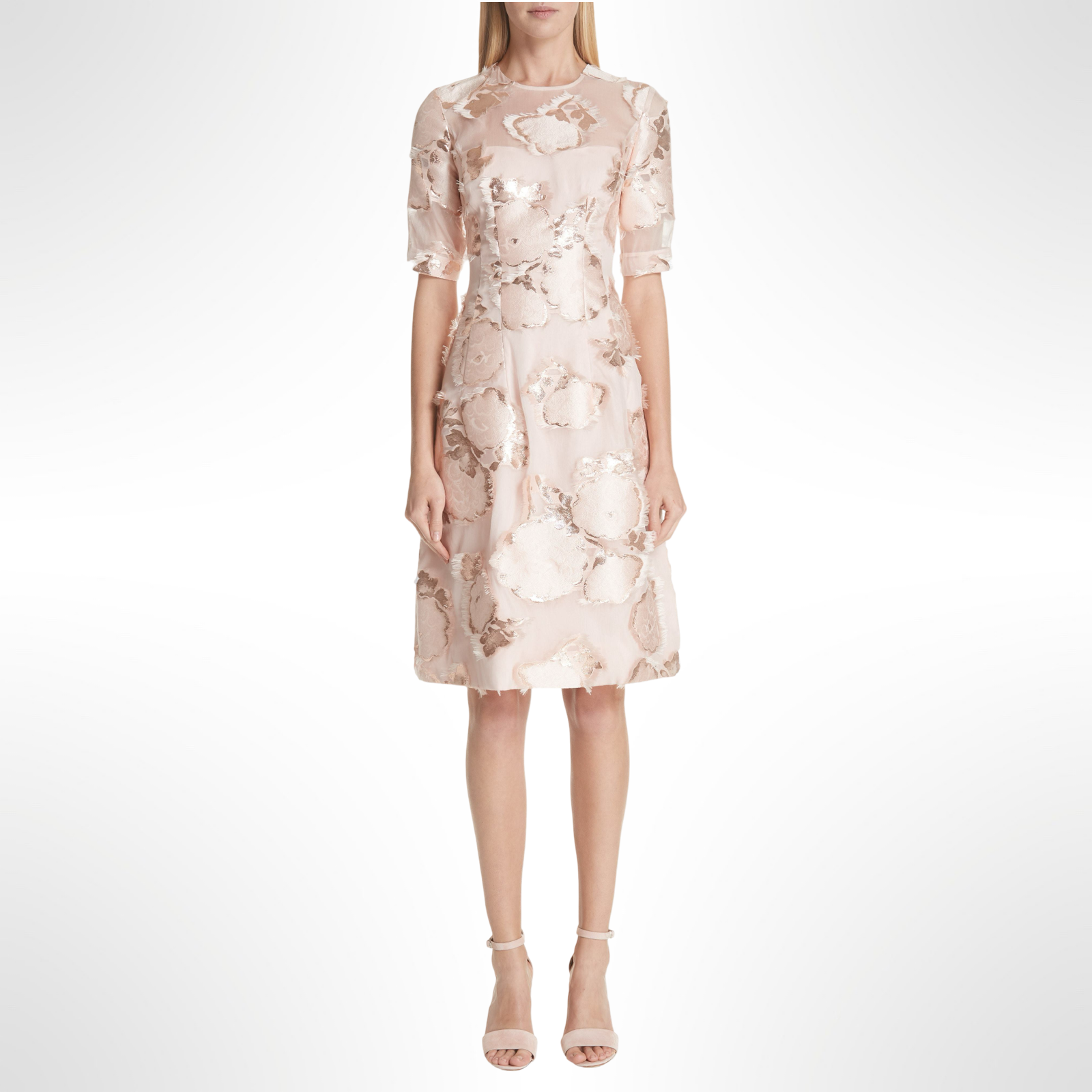 Pale pink short sleeve cocktail dress with textured floral brocade fabric.