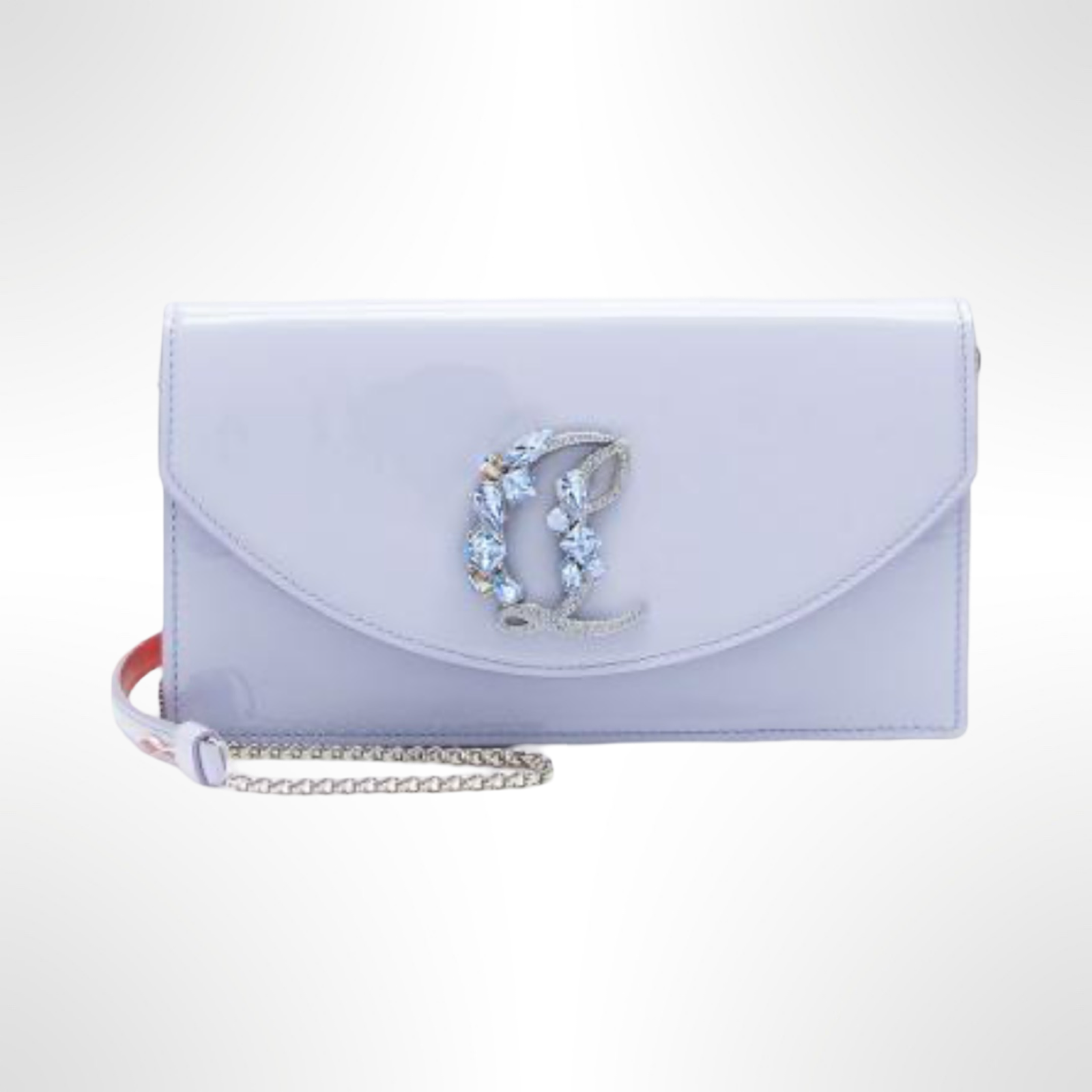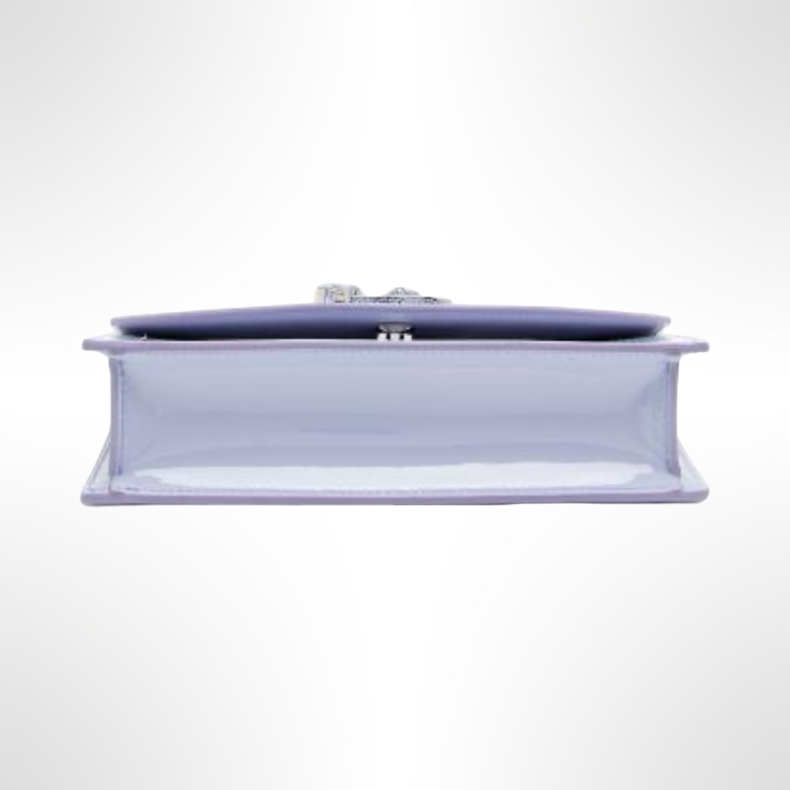 Lavender patent leather bag with rhinestone logo detail, snap close with detachable chain strap. Pristine condition, with flawless interior and dust bag included.