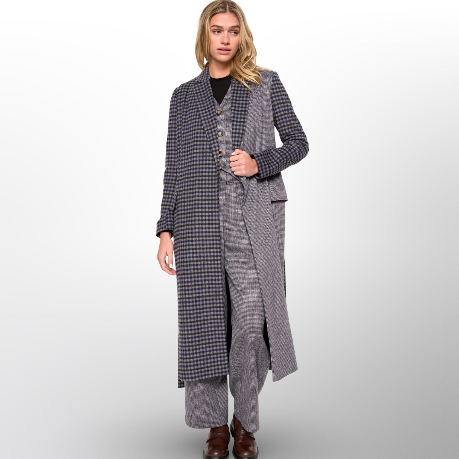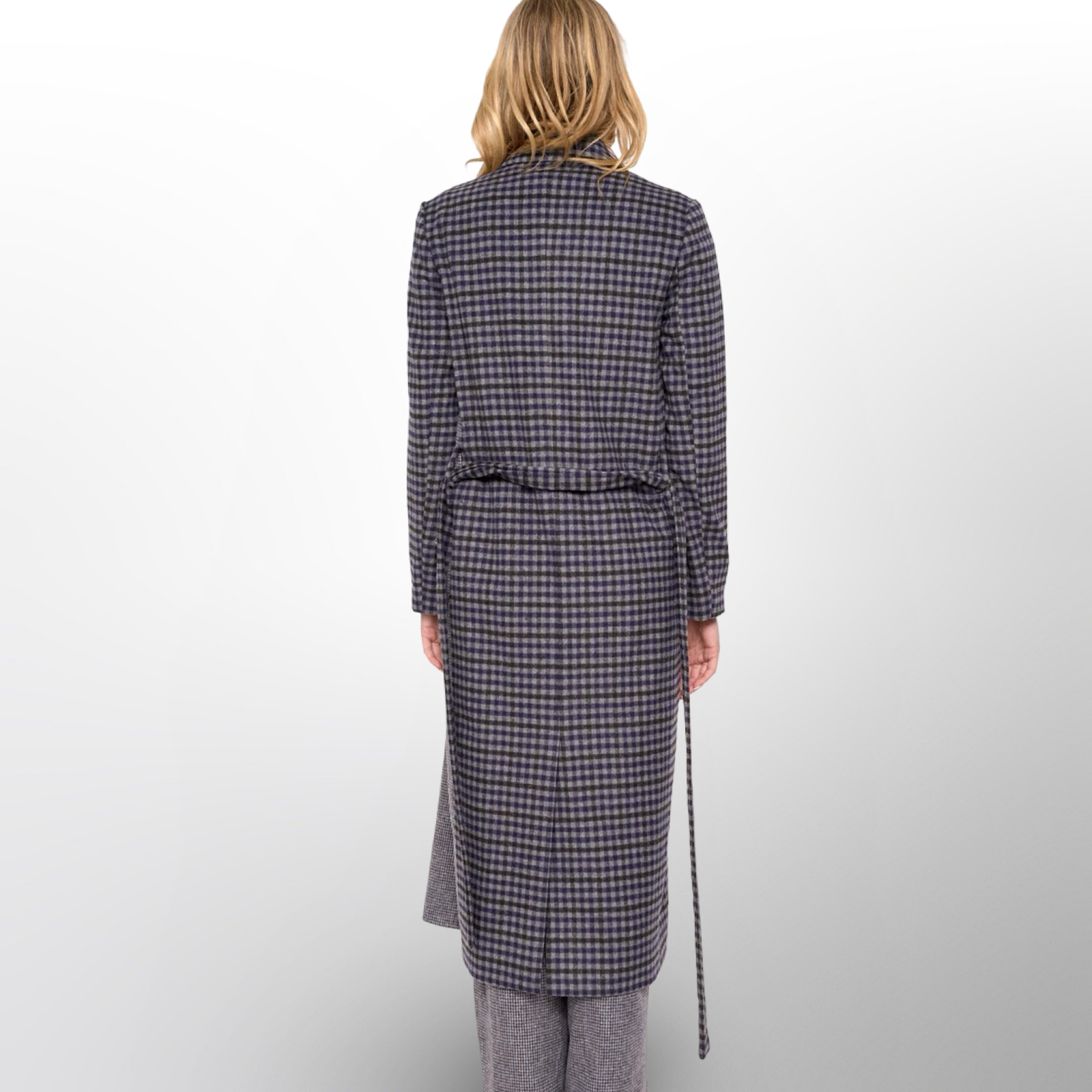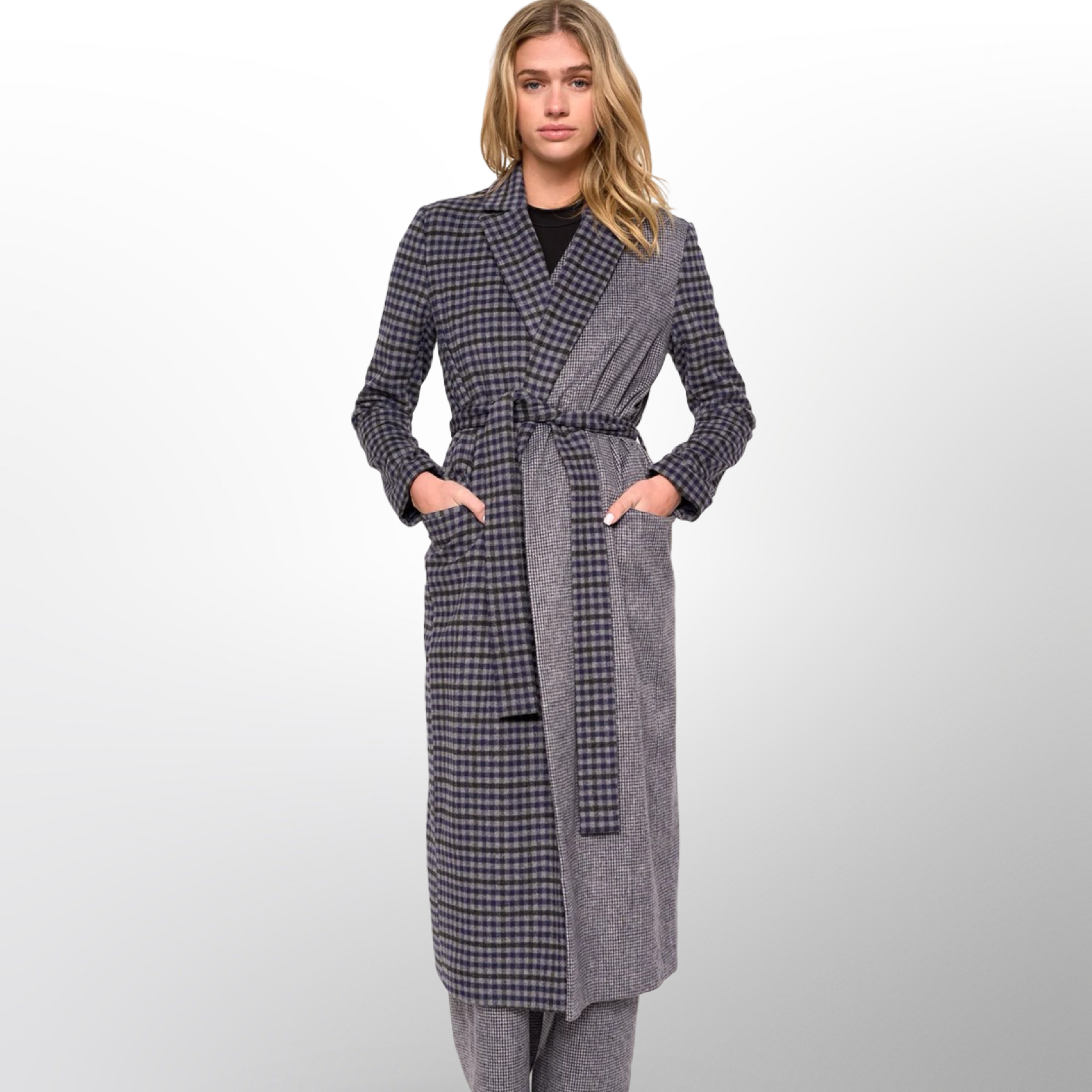 A versatile piece with a nod to classic menswear, this coat features mixed check prints and a long silhouette with a belted waist that enhances its tailored fit. Crafted from a premium navy and gray flannel fabric, it offers both warmth and timeless style through transitional seasons.