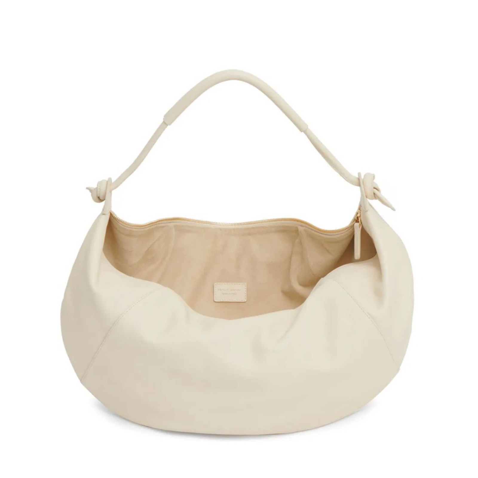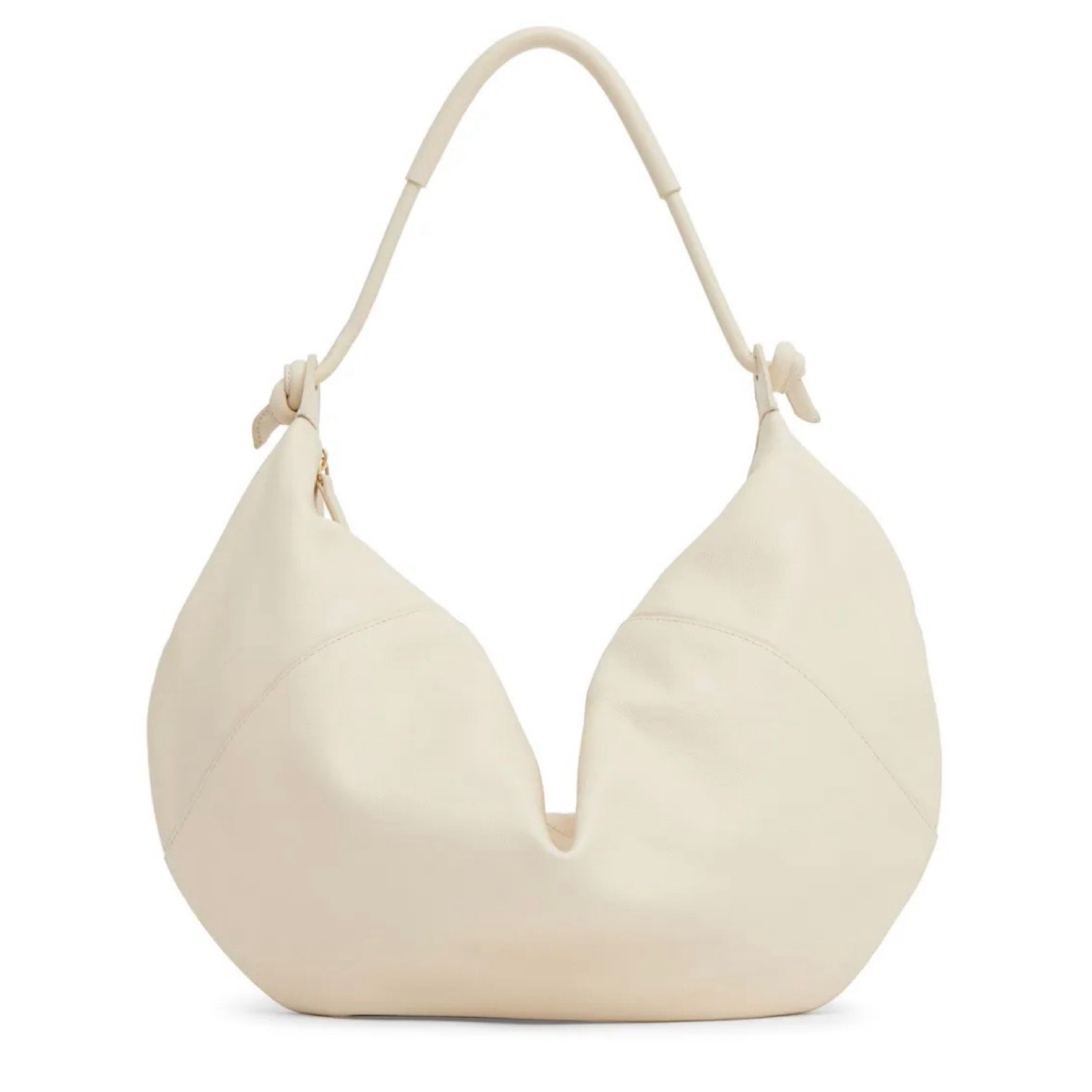 Ivory pebbled leather shoulder bag with just the right amount of soft slouch. Zip closure and fun knot strap detail, pristine condition.