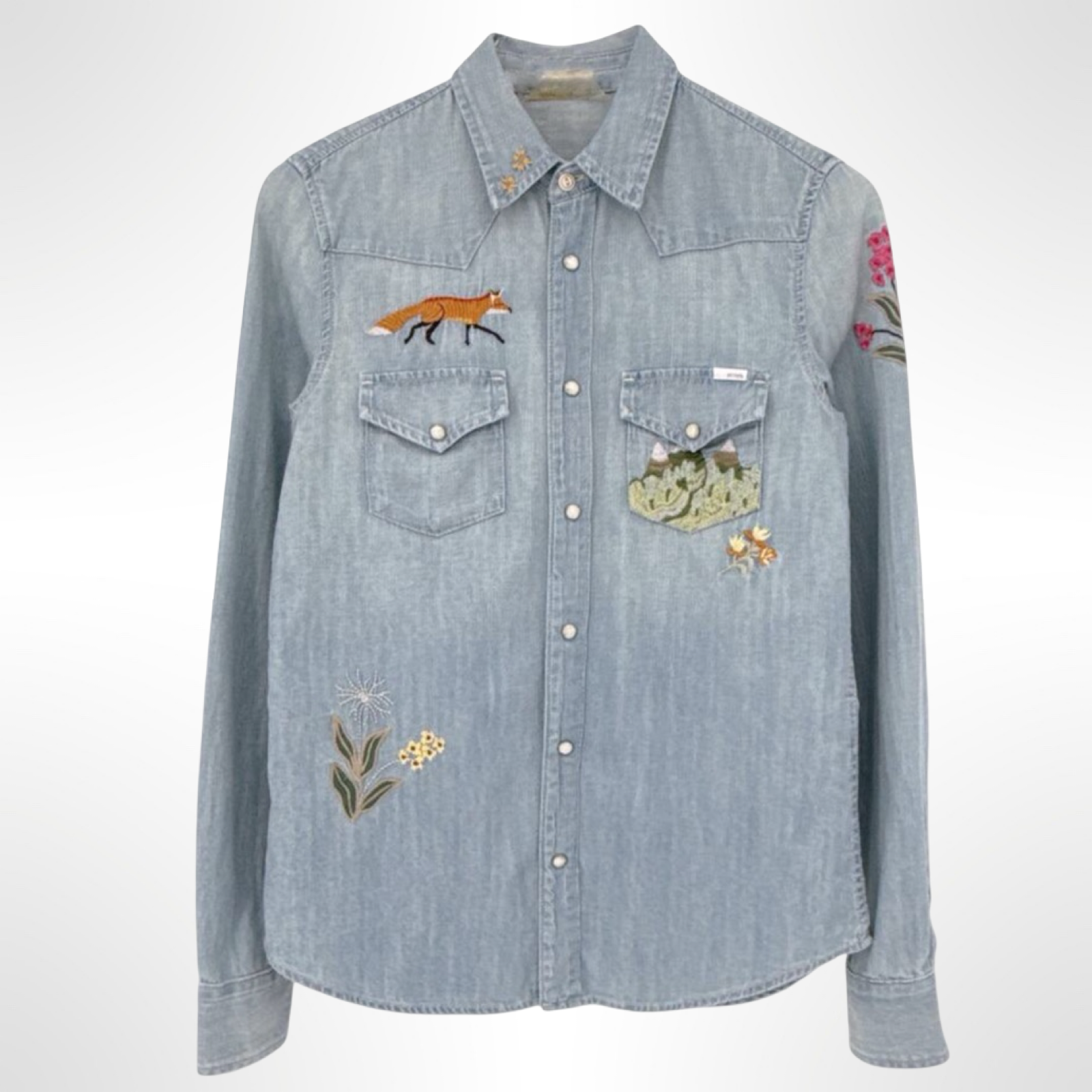 Light wash denim shirt with embroidered scenery allover, pearl snap close with chest pockets.