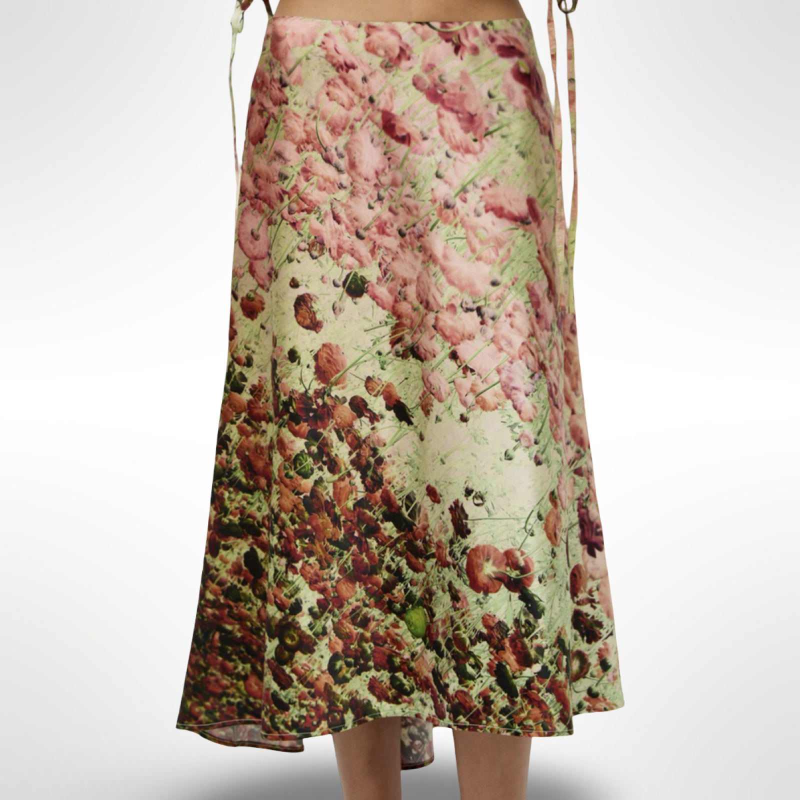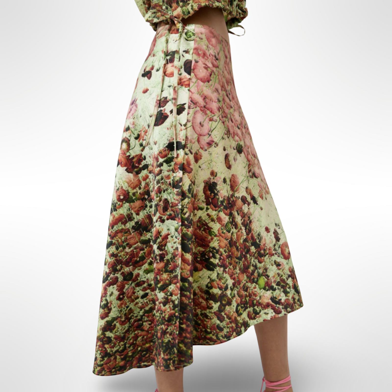 Mint and auburn floral silk blend midi skirt in flattering bias cut and side zip. Pairs with matching blouse. NWT, Orig. $395.