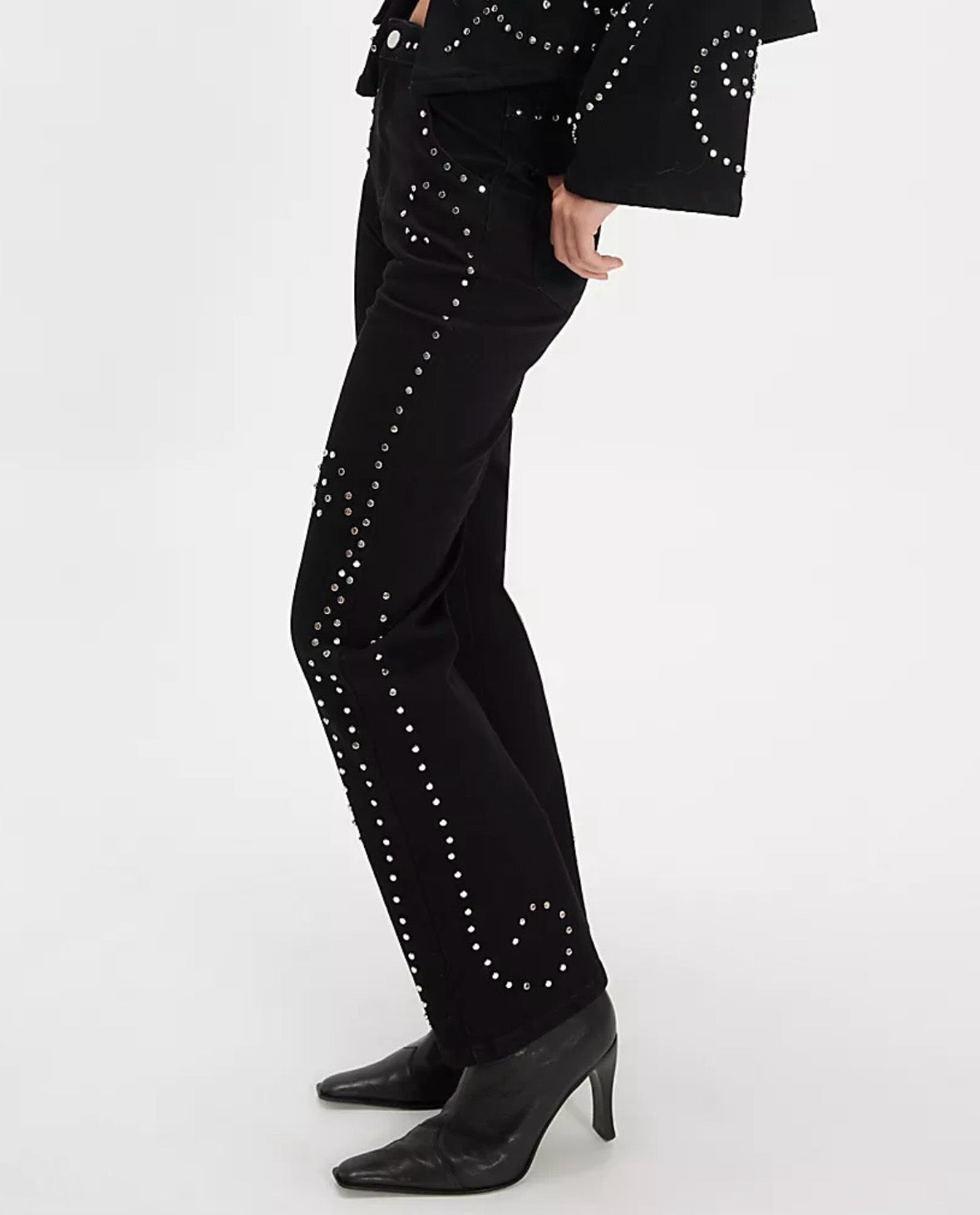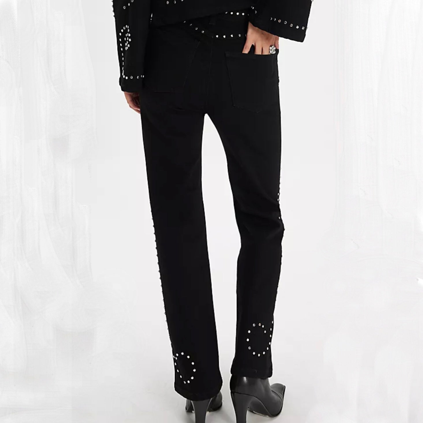 Spice it up with a hint of southwest with an edge with these black stretch cropped jeans with all over silver stud design. Responsibly made in Uruguay.