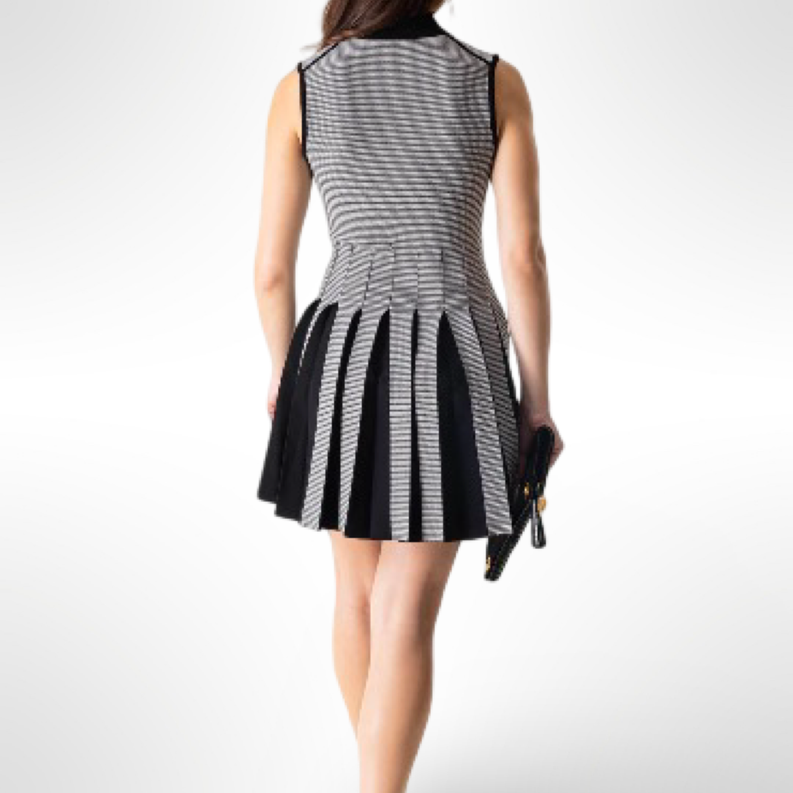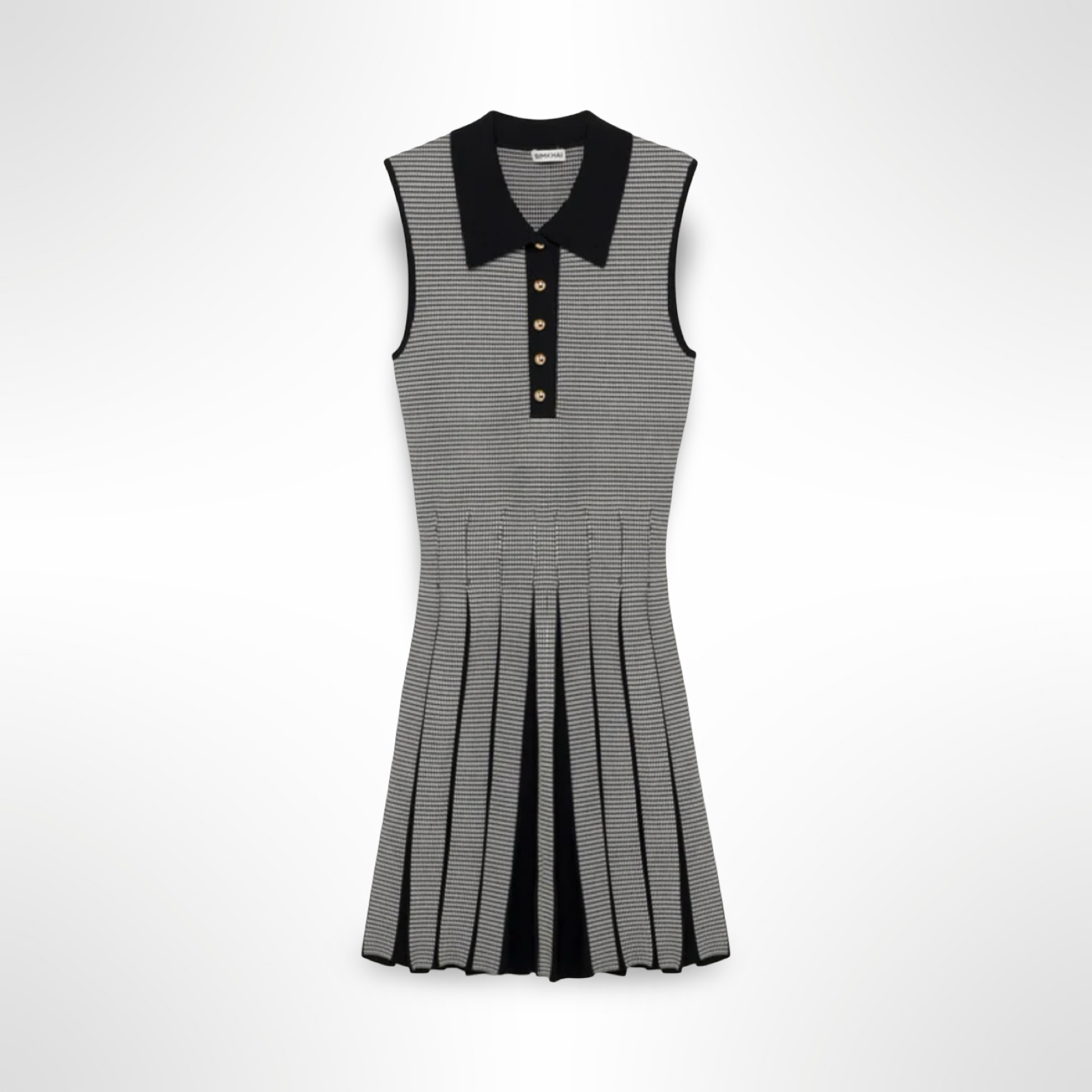 Black and white textured knit dress with collar and box pleat skirt details, NWT.