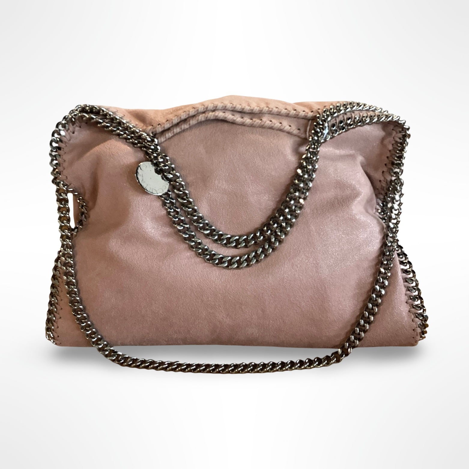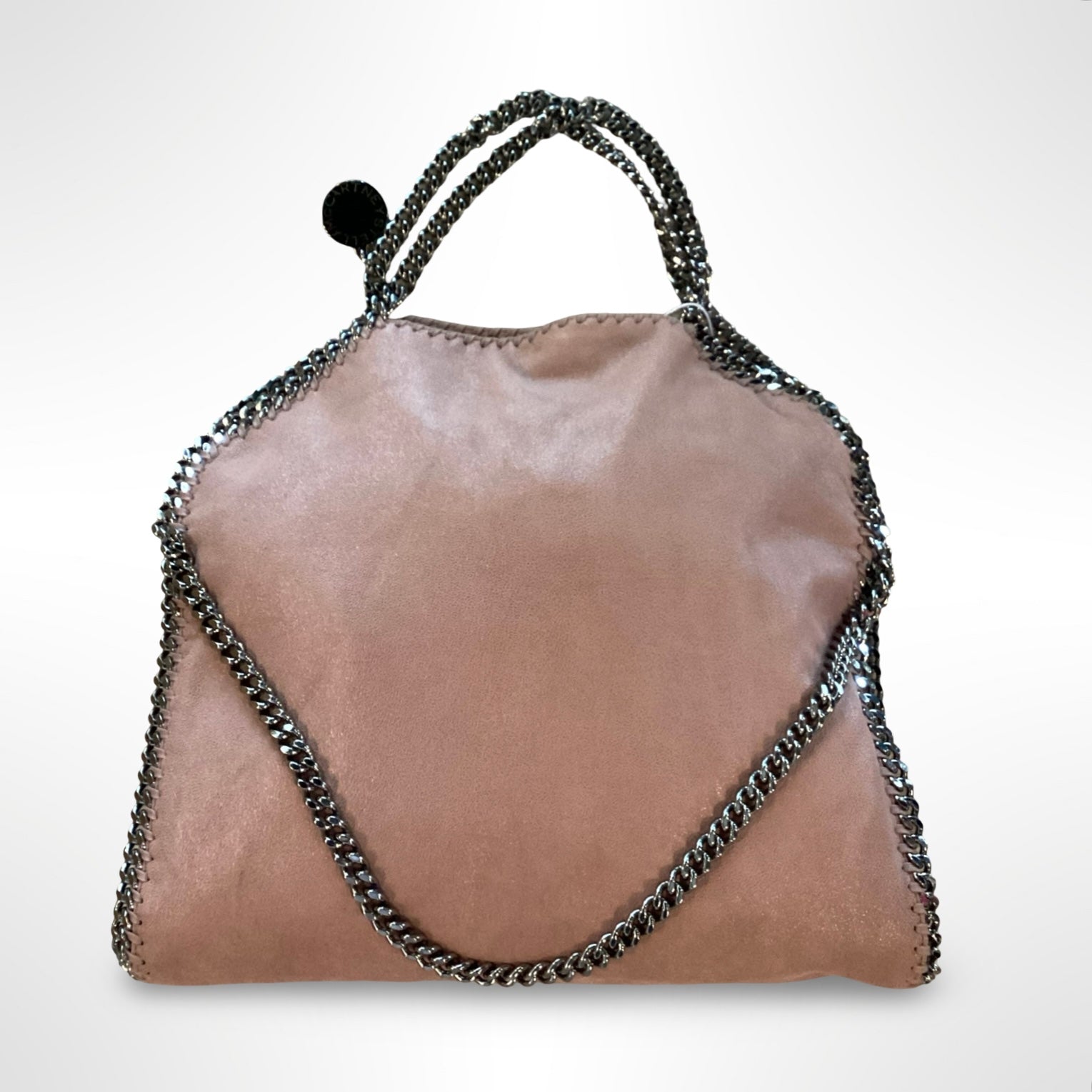 A versatile classic, this tote can be carried as a shoulder bag or a fold over, done in soft blush vegan leather with silver chain trim. Magnetic snap close and interior zip pocket, in excellent condition with dust bag.