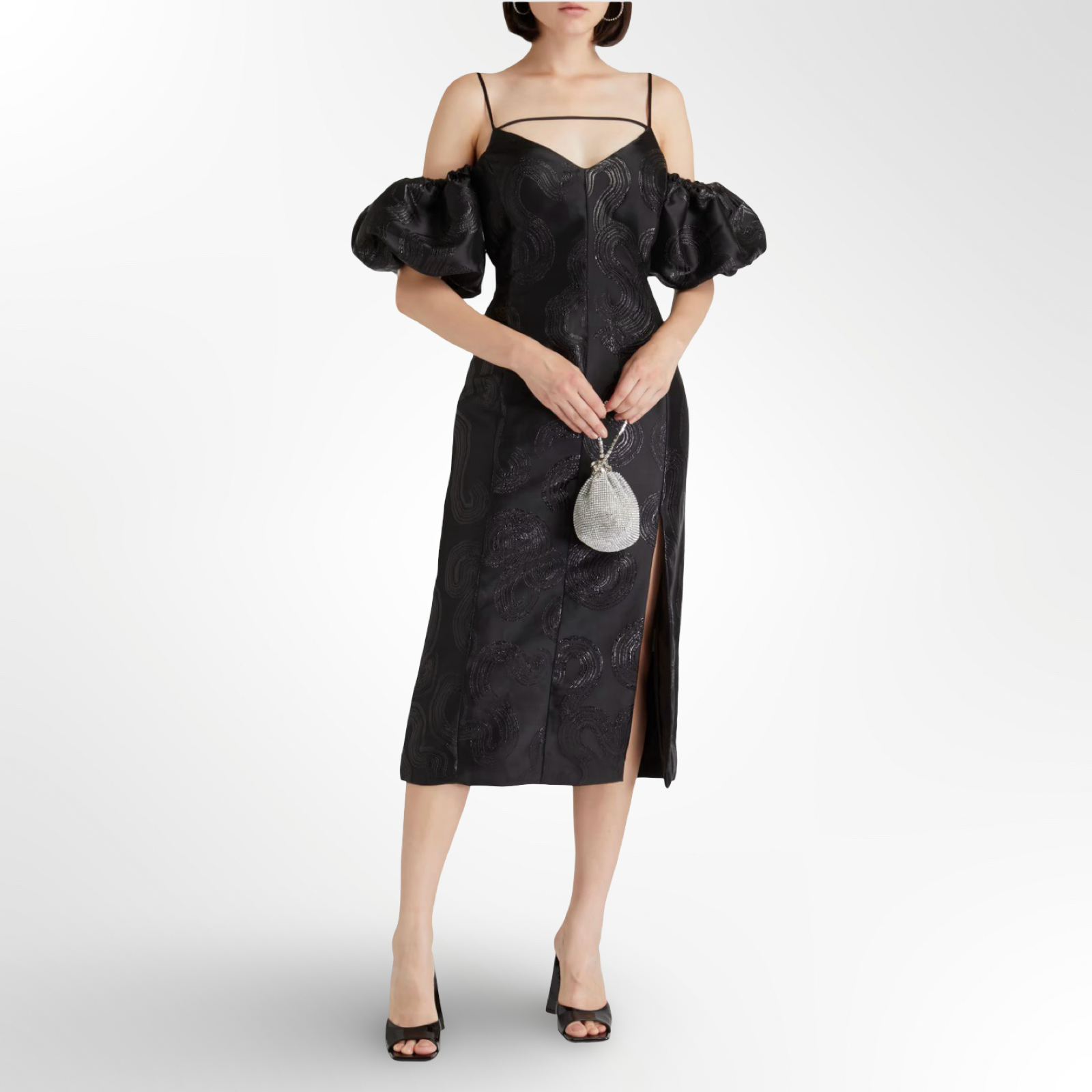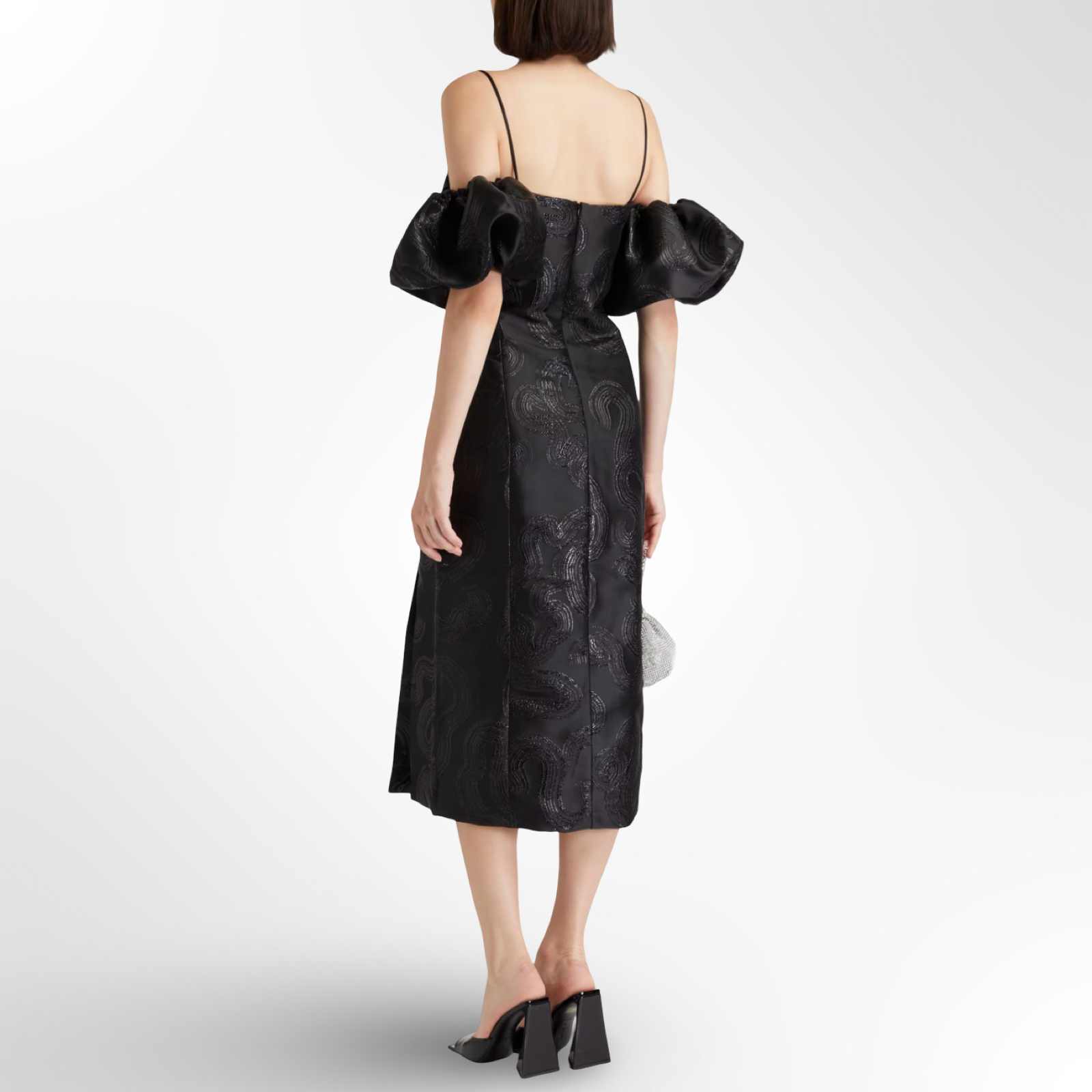Tone on tone swirling brocade gown with off the shoulder puff sleeves. Pristine condition.