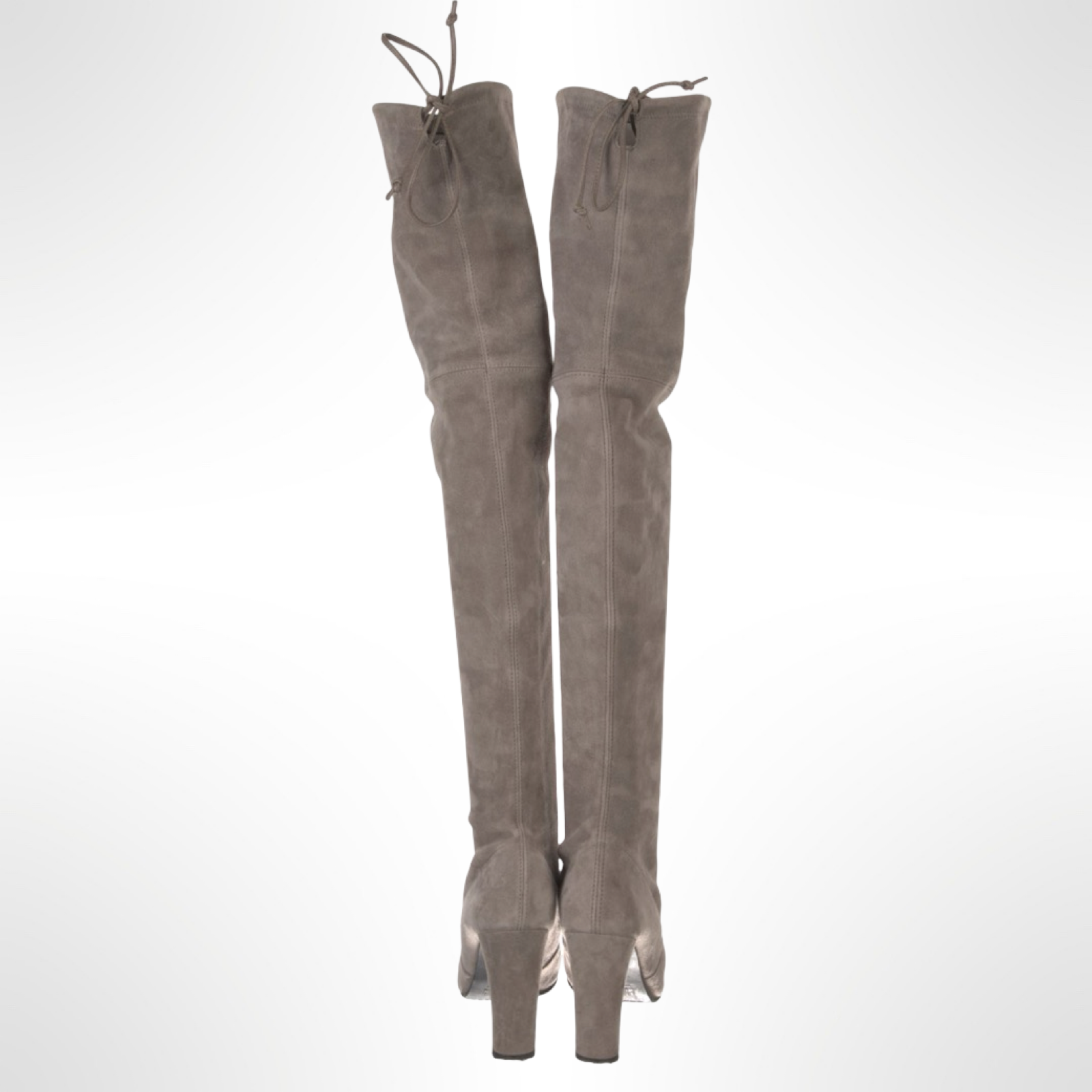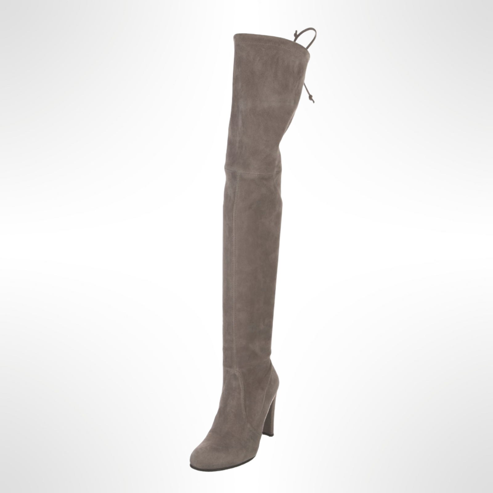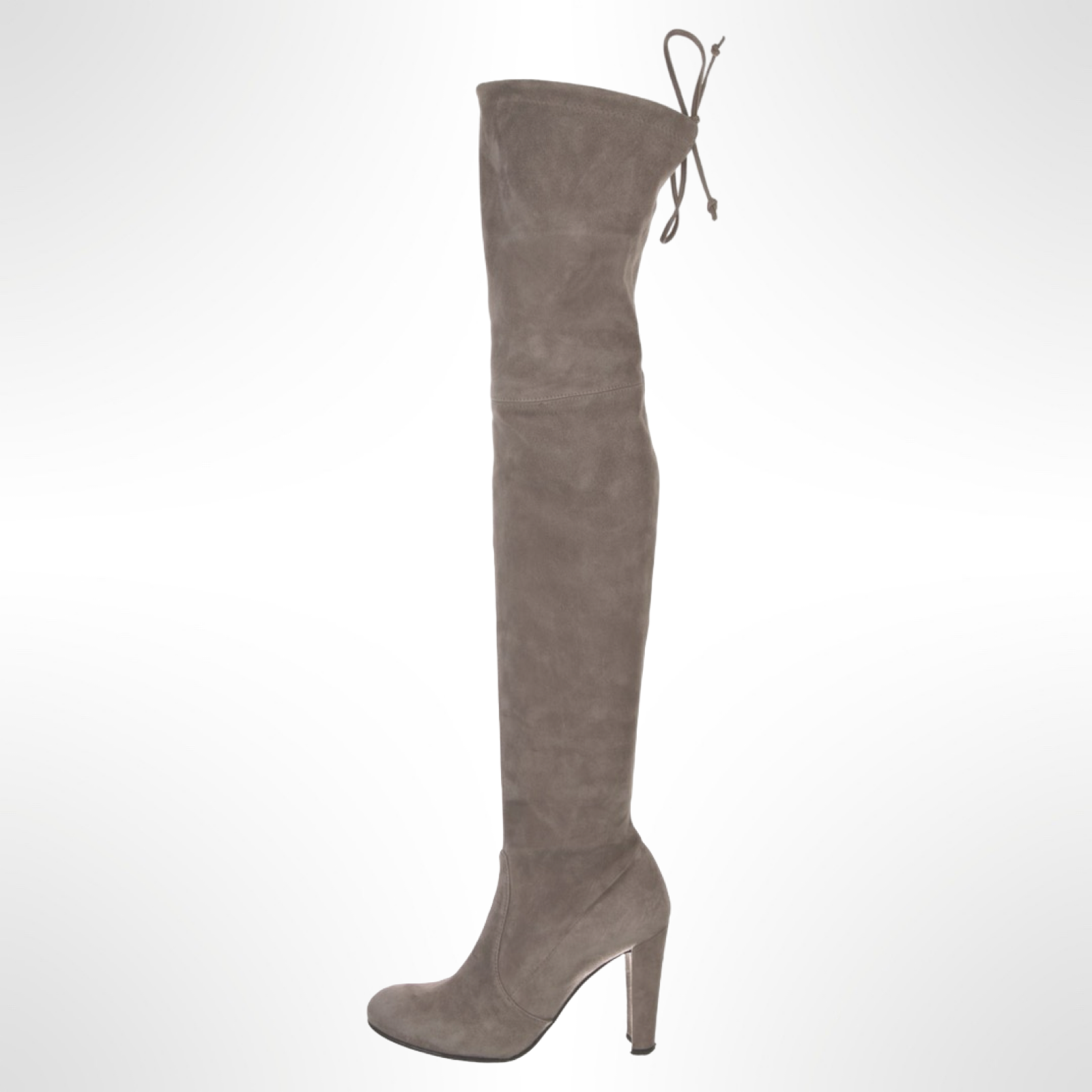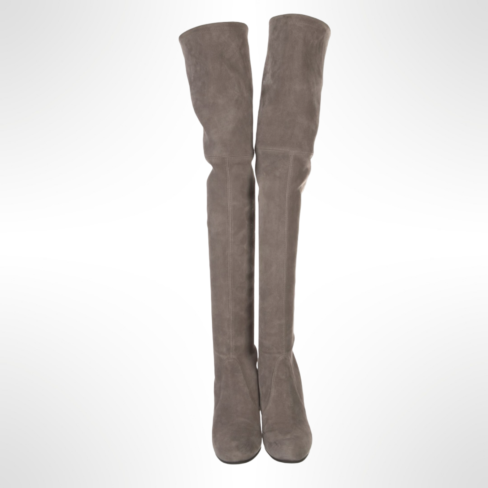 Fall fashion is calling and these soft gray stretch suede boots are a fab way to answer and complete a sassy, seasonal look. Tie closures, almond toe and 4” heel, excellent condition.