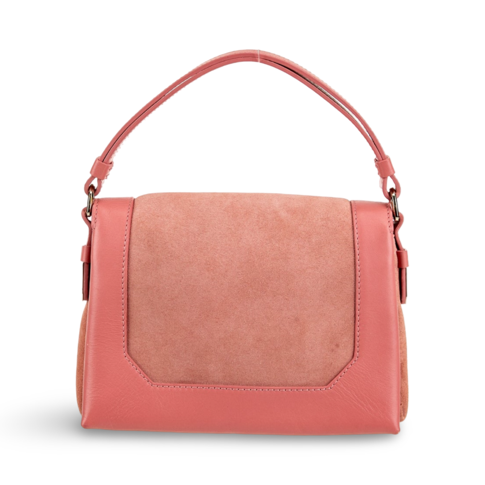 Small top handle trio bag in baby pink suede and smooth leather combo. Three Interior satin lined compartments, snap close and gold tone hardware. Minor markings on bottom, good condition otherwise.