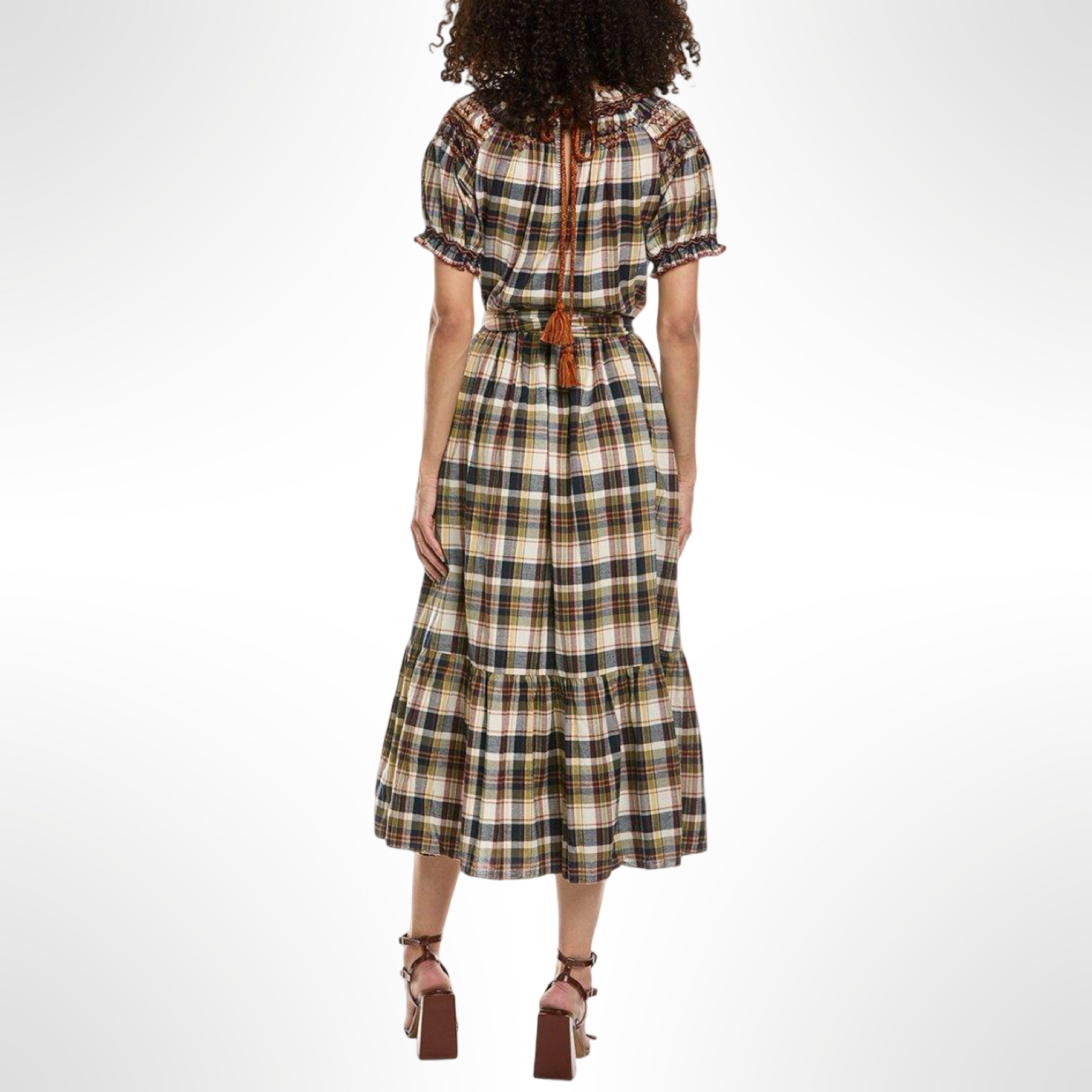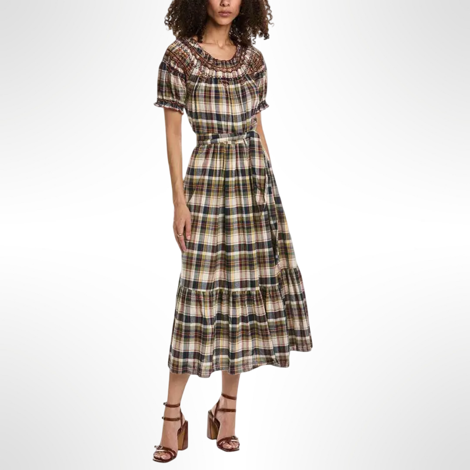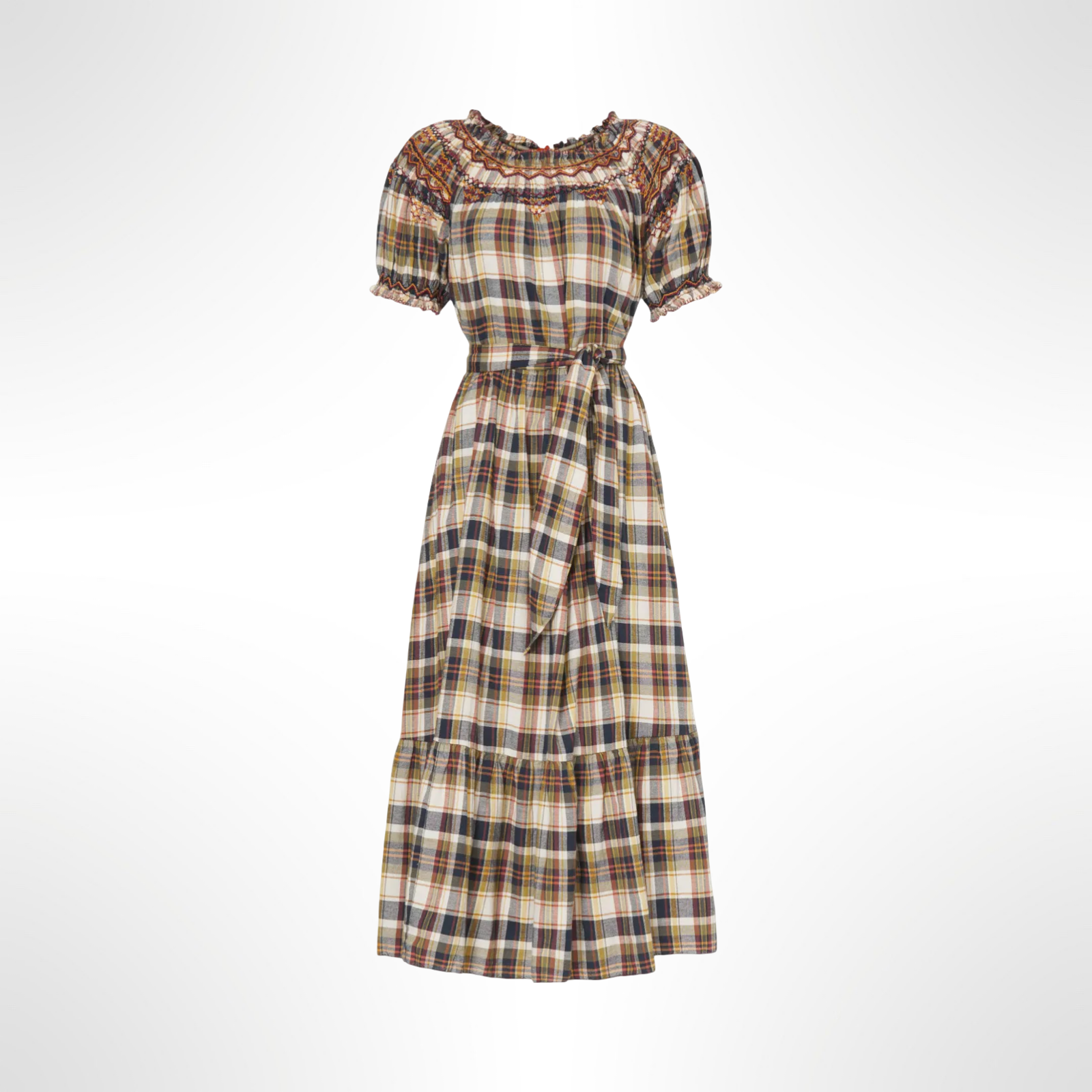 This peasant-style embroidered plaid dress by The Great features a removable belt for a flatter fit and easily transitions from day to night with a quick accessory change.