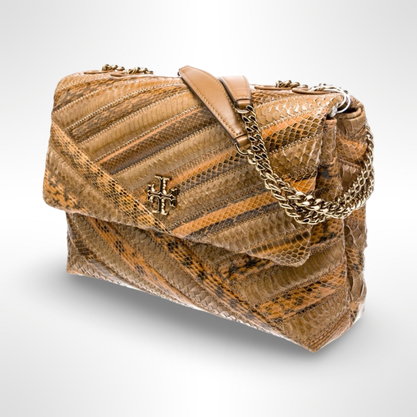 Kick off autumn with this elegant statement bag. Caramel snake embossed leather patchwork shoulder bag with snap close and gold tone chain strap. Lined interior with zippered compartments, no signs of wear in pristine condition.