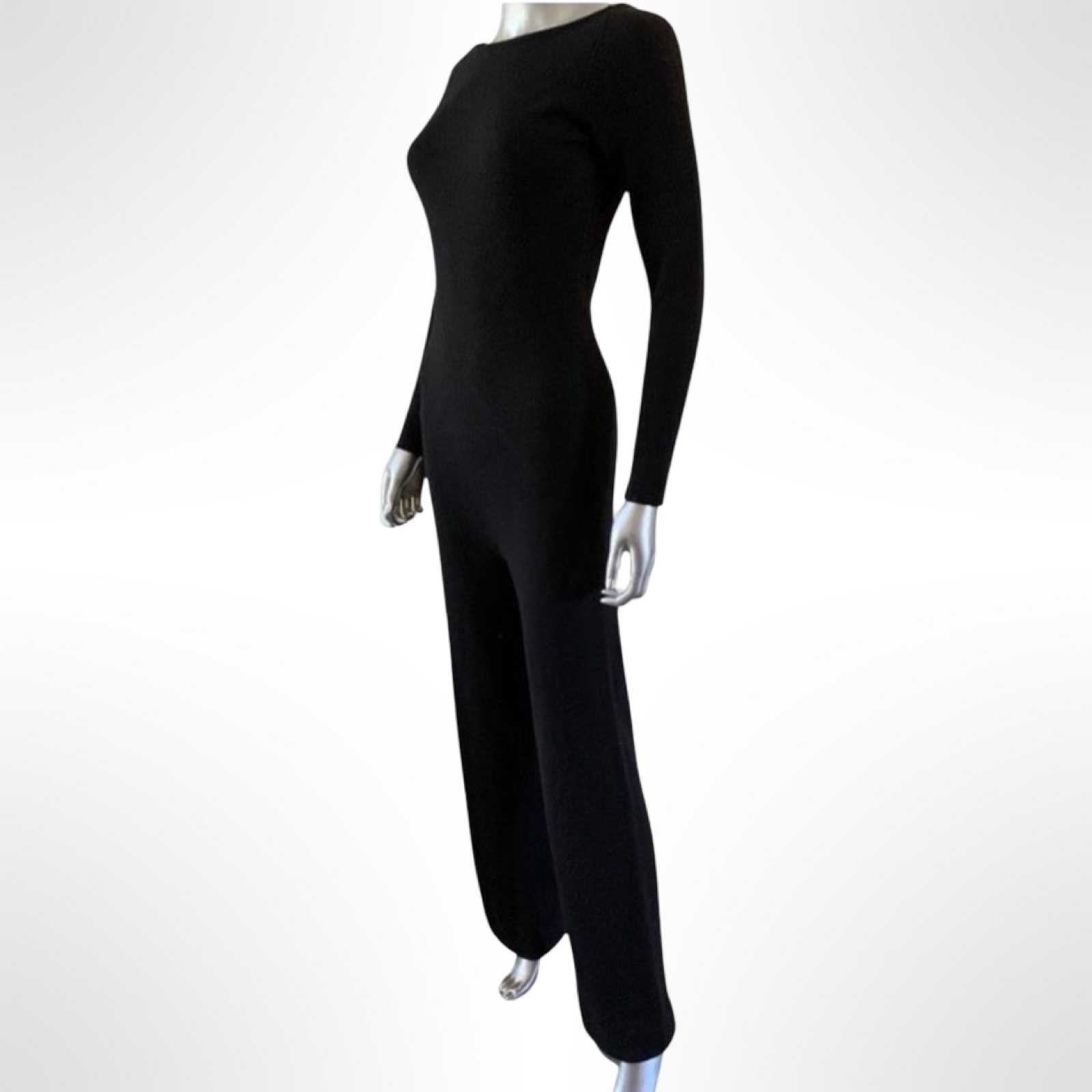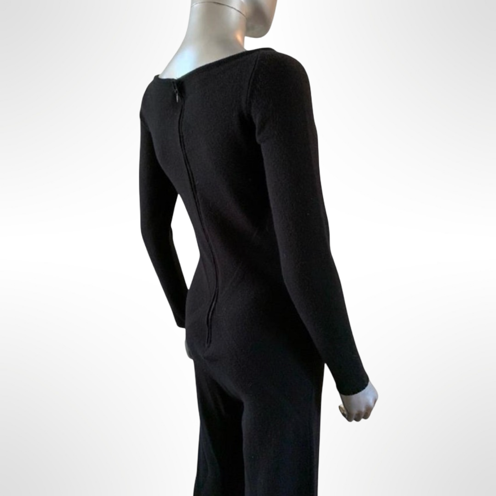 A rare find, this elegant wool/cashmere blend knit catsuit offers both a feminine form fitting silhouette and sophisticated coziness, with minimal effort. Featuring long sleeves, a flared leg pant and hidden back zip. A perfect casual winter outfit.