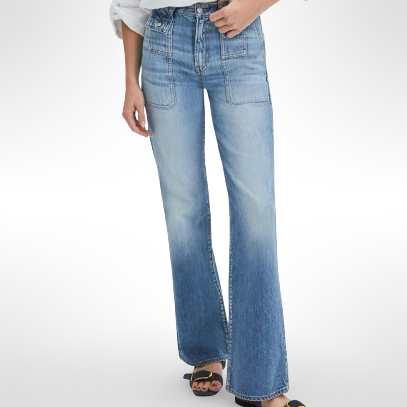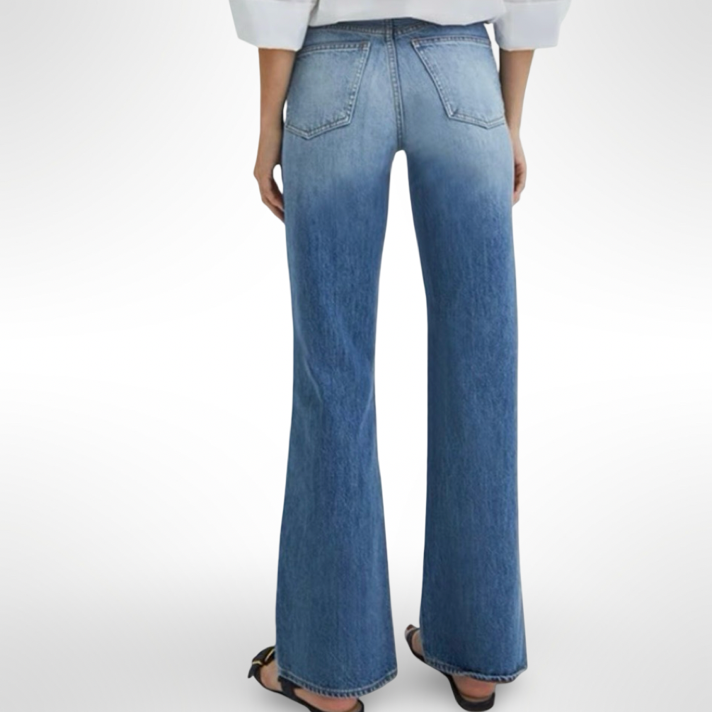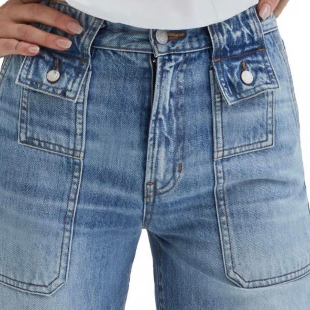 Medium wash high waisted wide leg denim with double stitched hip pocket and vintage distressing details.