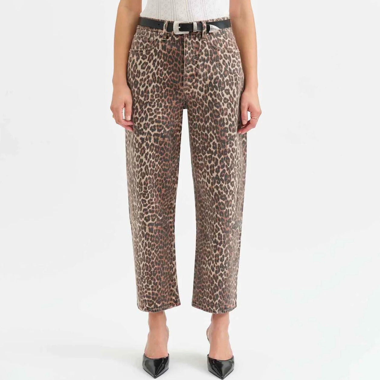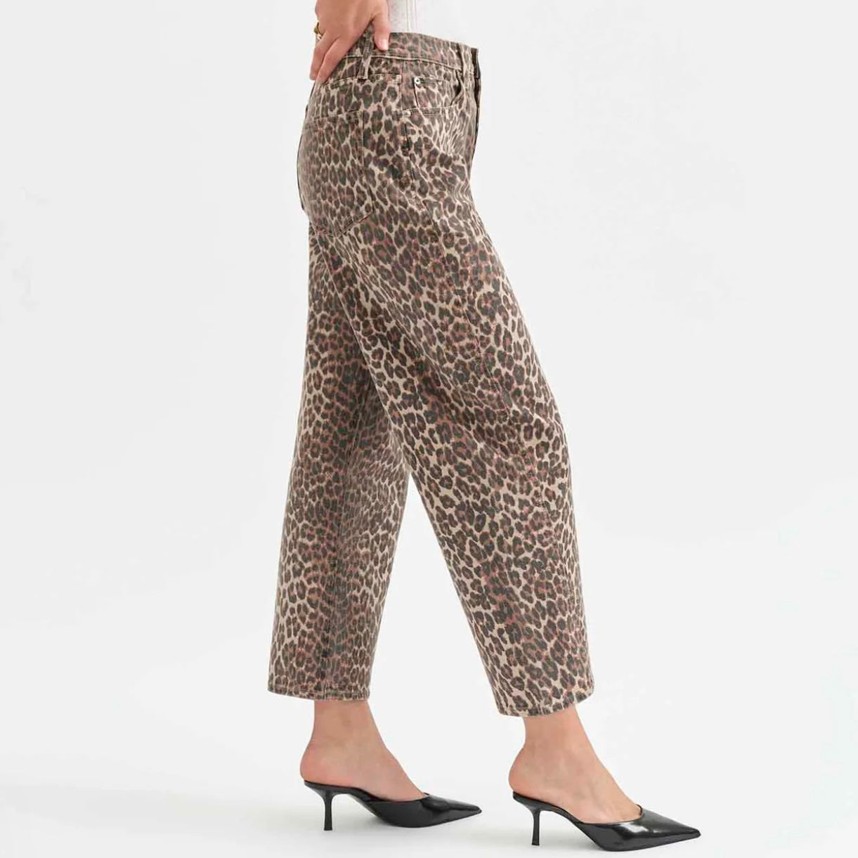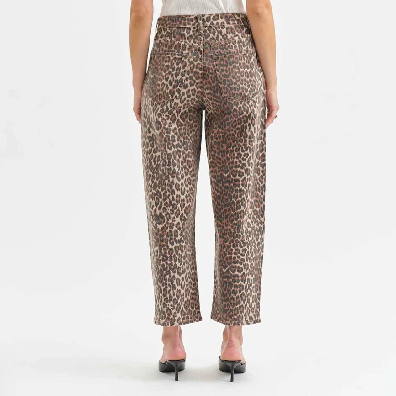 Meow! A trendy must try, this is the perfect barrel leg stretch denim in brown cool cat print.