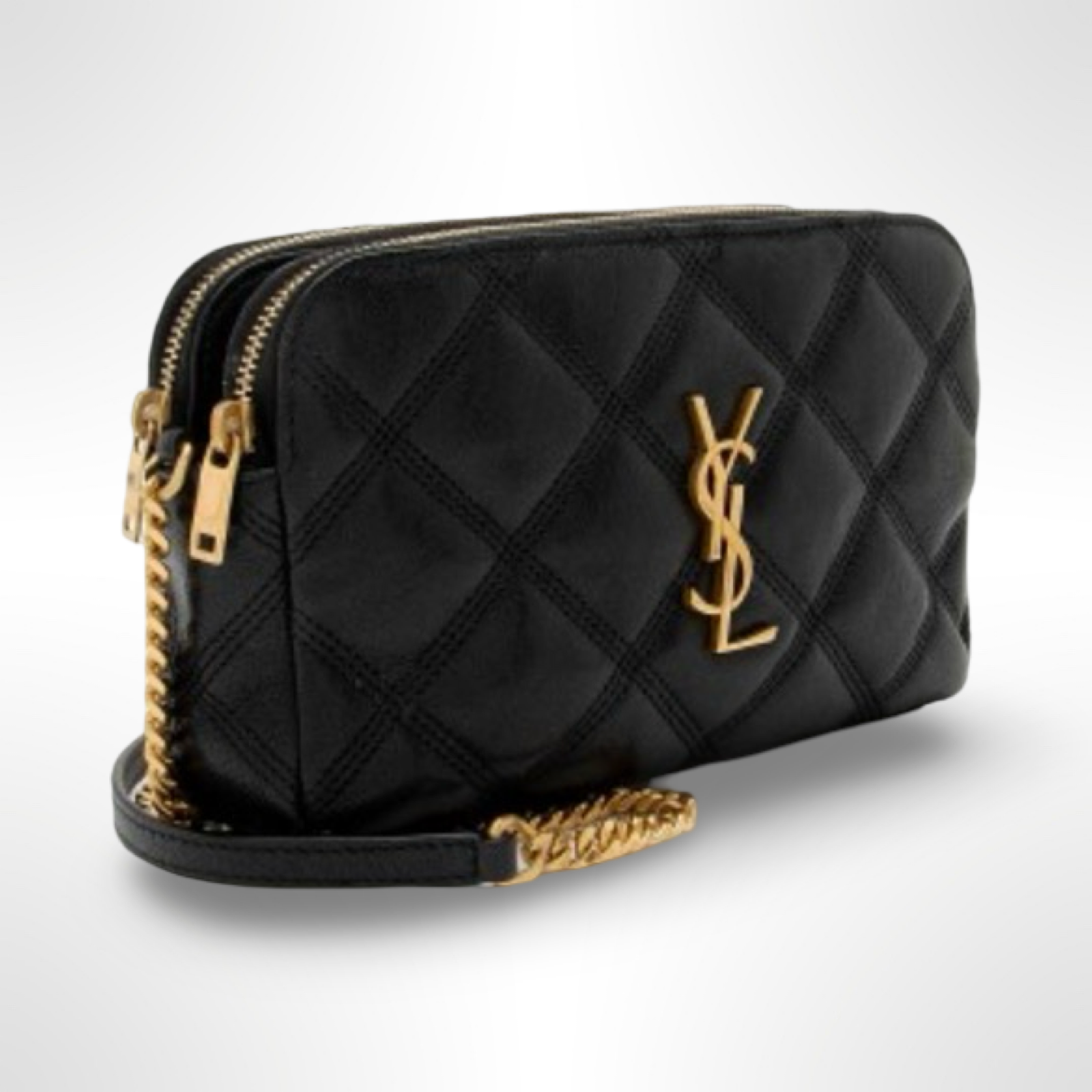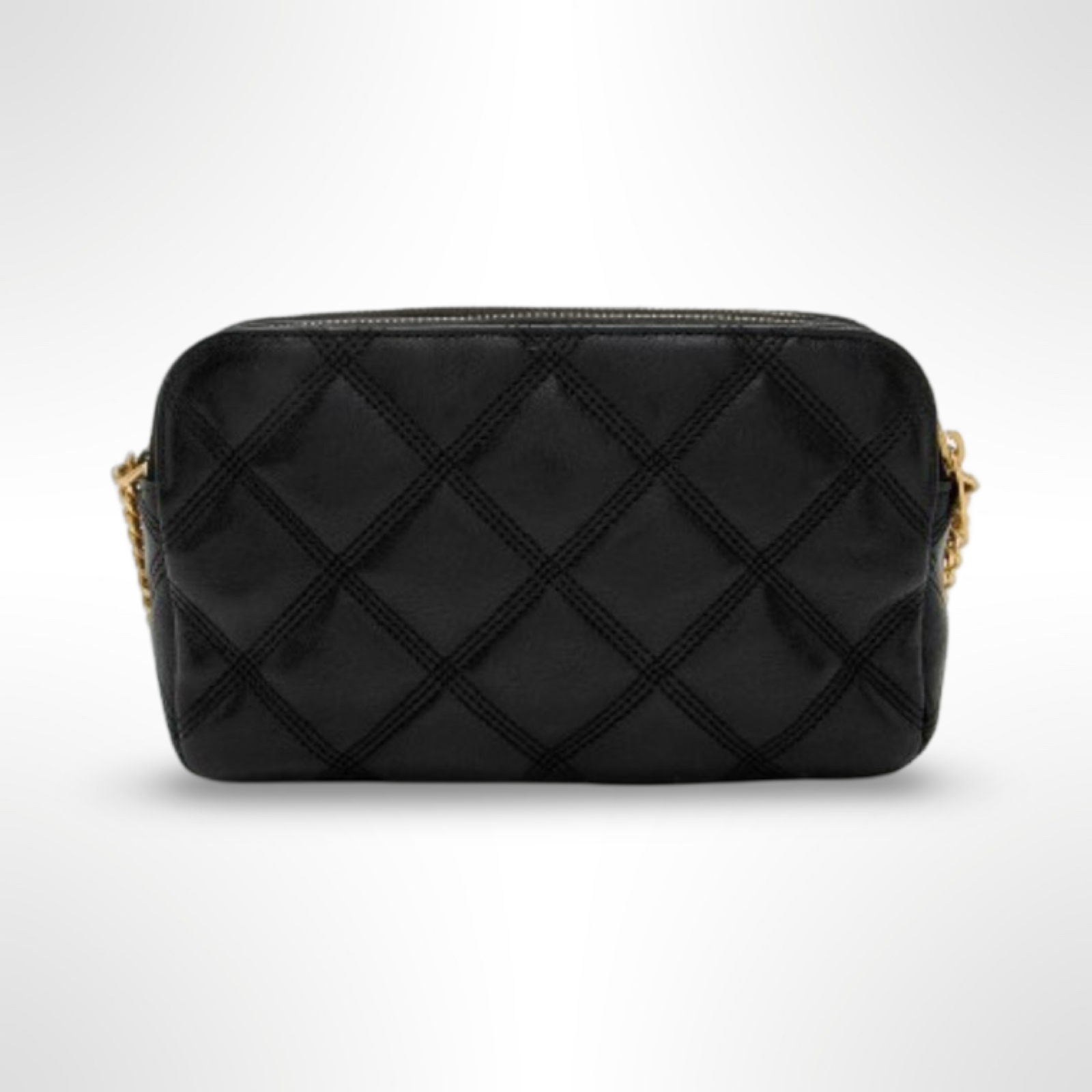 Black quilted leather crossbody bag with double zip compartments and gold tone hardware. Excellent condition.